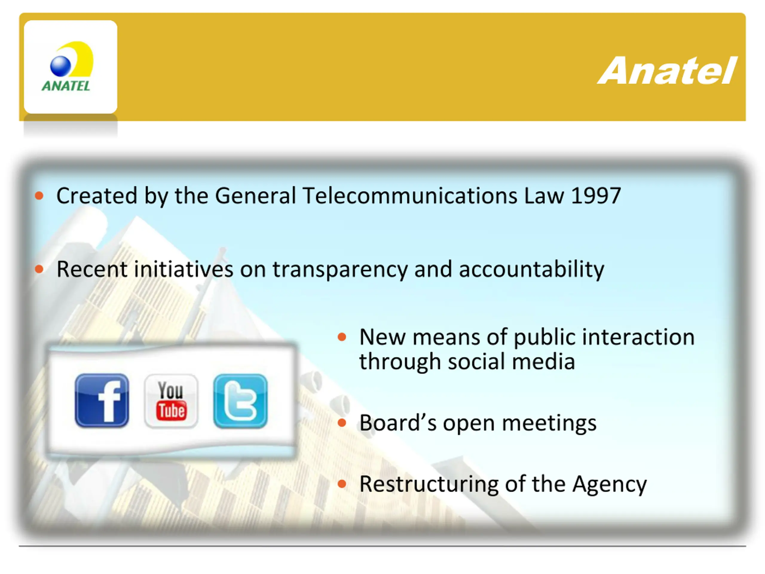 Anatel Created by the General Telecommunications Law 1997 Recent initiatives on transparency and accountability New means of public interaction through social media Board s open meetings Restructuring of the Agency