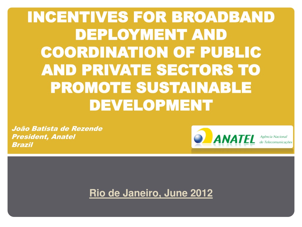 INCENTIVES FOR BROADBAND INCENTIVES FOR BROADBAND DEPLOYMENT AND DEPLOYMENT AND COORDINATION OF PUBLIC COORDINATION OF PUBLIC AND PRIVATE SECTORS TO AND PRIVATE SECTORS TO PROMOTE SUSTAINABLE PROMOTE SUSTAINABLE DEVELOPMENT DEVELOPMENT Jo o Batista de Rezende President, Anatel Brazil Rio de Janeiro, June 2012
