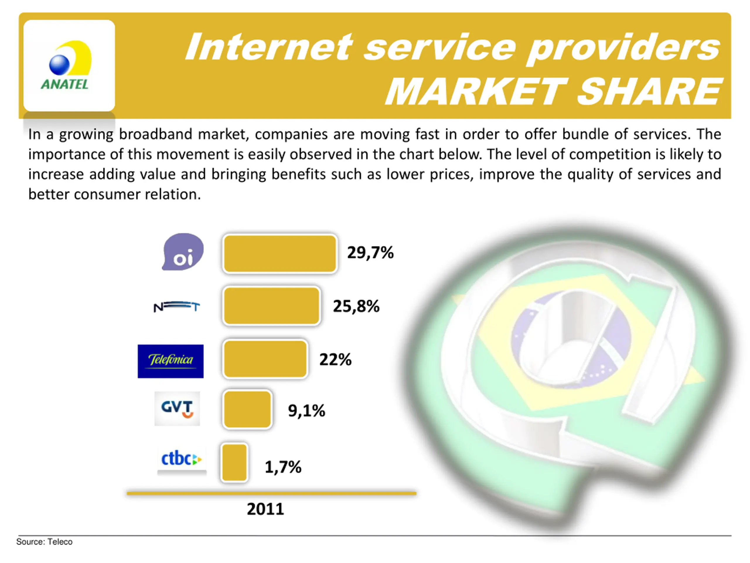 Internet service providers MARKET SHARE In a growing broadband market, companies are moving fast in order to offer bundle of services. The importance of this movement is easily observed in the chart below. The level of competition is likely to increase adding value and bringing benefits such as lower prices, improve the quality of services and better consumer relation. 29,7% 25,8% 22% 9,1% 1,7% 2011 Source: Teleco