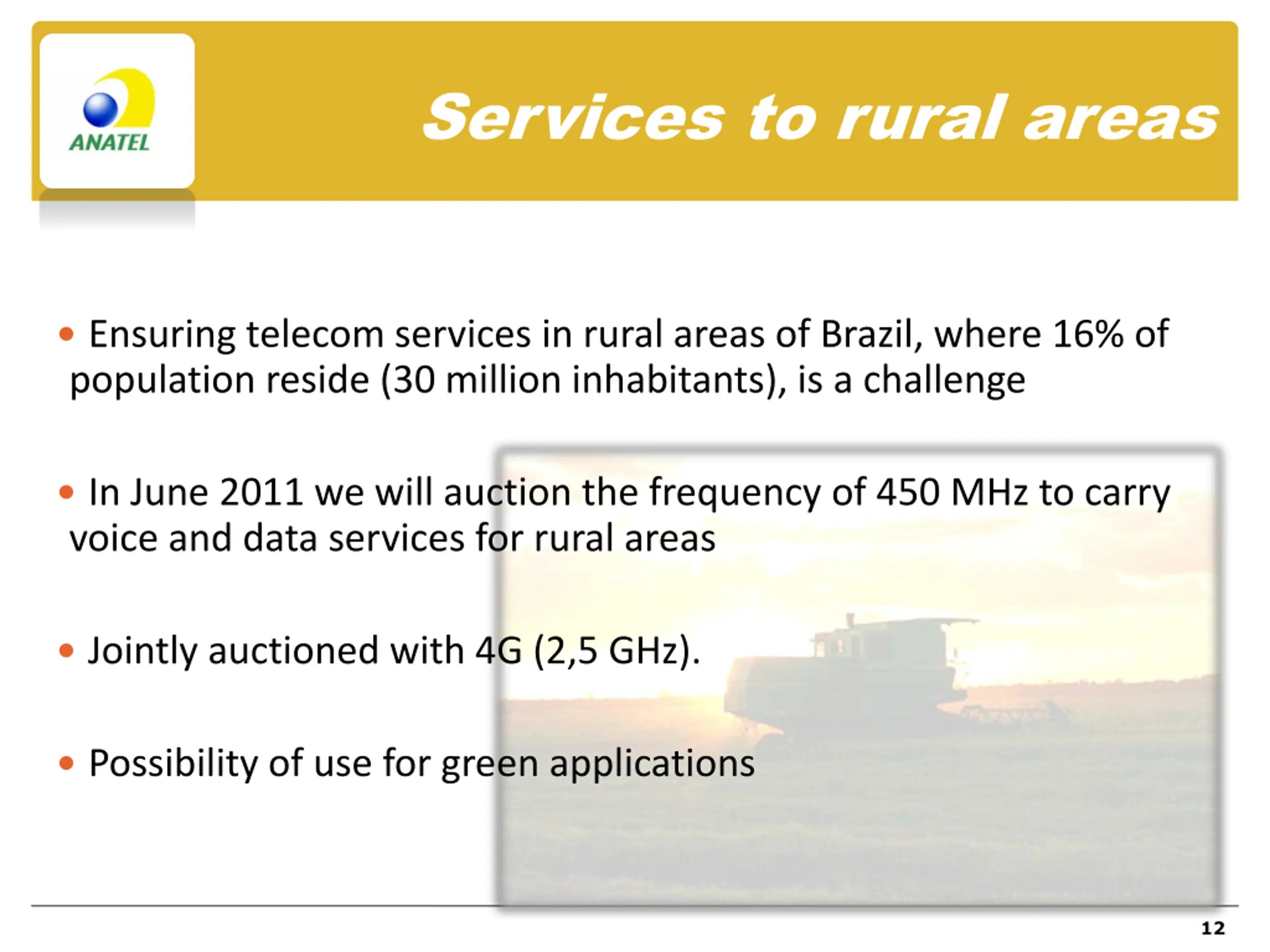 Services to rural areas Ensuring telecom services in rural areas of Brazil, where 16% of population reside (30 million inhabitants), is a challenge In June 2011 we will auction the frequency of 450 MHz to carry voice and data services for rural areas Jointly auctioned with 4G (2,5 GHz). Possibility of use for green applications 12