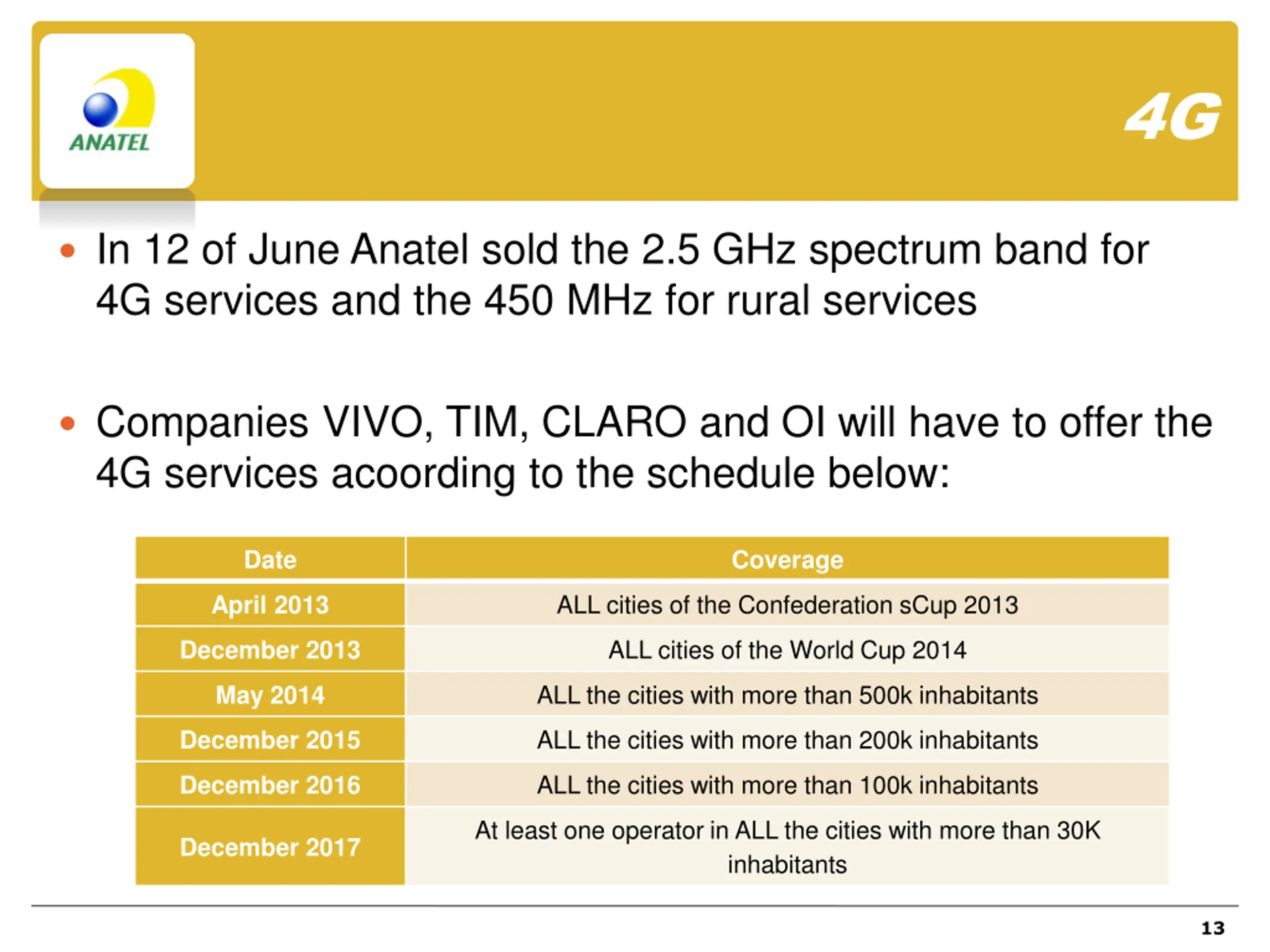 4G In 12 of June Anatel sold the 2.5 GHz spectrum band for 4G services and the 450 MHz for rural services Companies VIVO, TIM, CLARO and OI will have to offer the 4G services acoording to the schedule below: Date Coverage ALL cities of the Confederation sCup 2013 April 2013 ALL cities of the World Cup 2014 December 2013 ALL the cities with more than 500k inhabitants May 2014 ALL the cities with more than 200k inhabitants December 2015 ALL the cities with more than 100k inhabitants December 2016 At least one operator in ALL the cities with more than 30K inhabitants December 2017 13