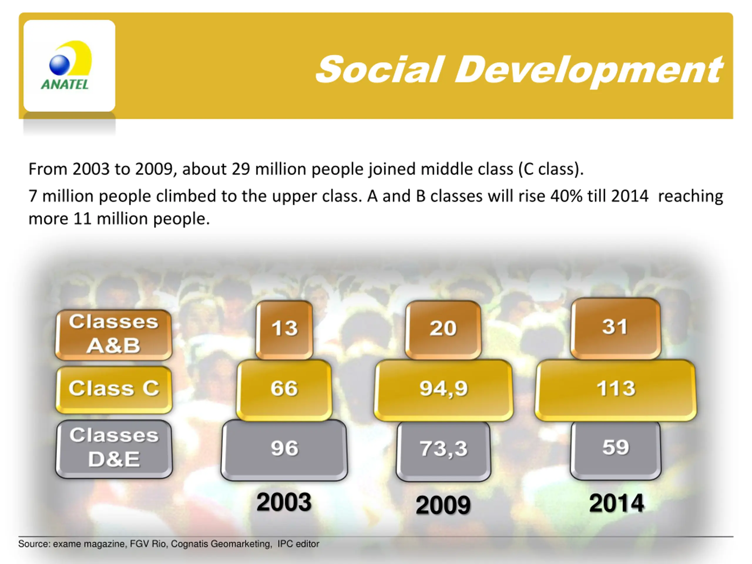Social Development From 2003 to 2009, about 29 million people joined middle class (C class). 7 million people climbed to the upper class. A and B classes will rise 40% till 2014 reaching more 11 million people. 2003 2014 2009 Source: exame magazine, FGV Rio, Cognatis Geomarketing, IPC editor