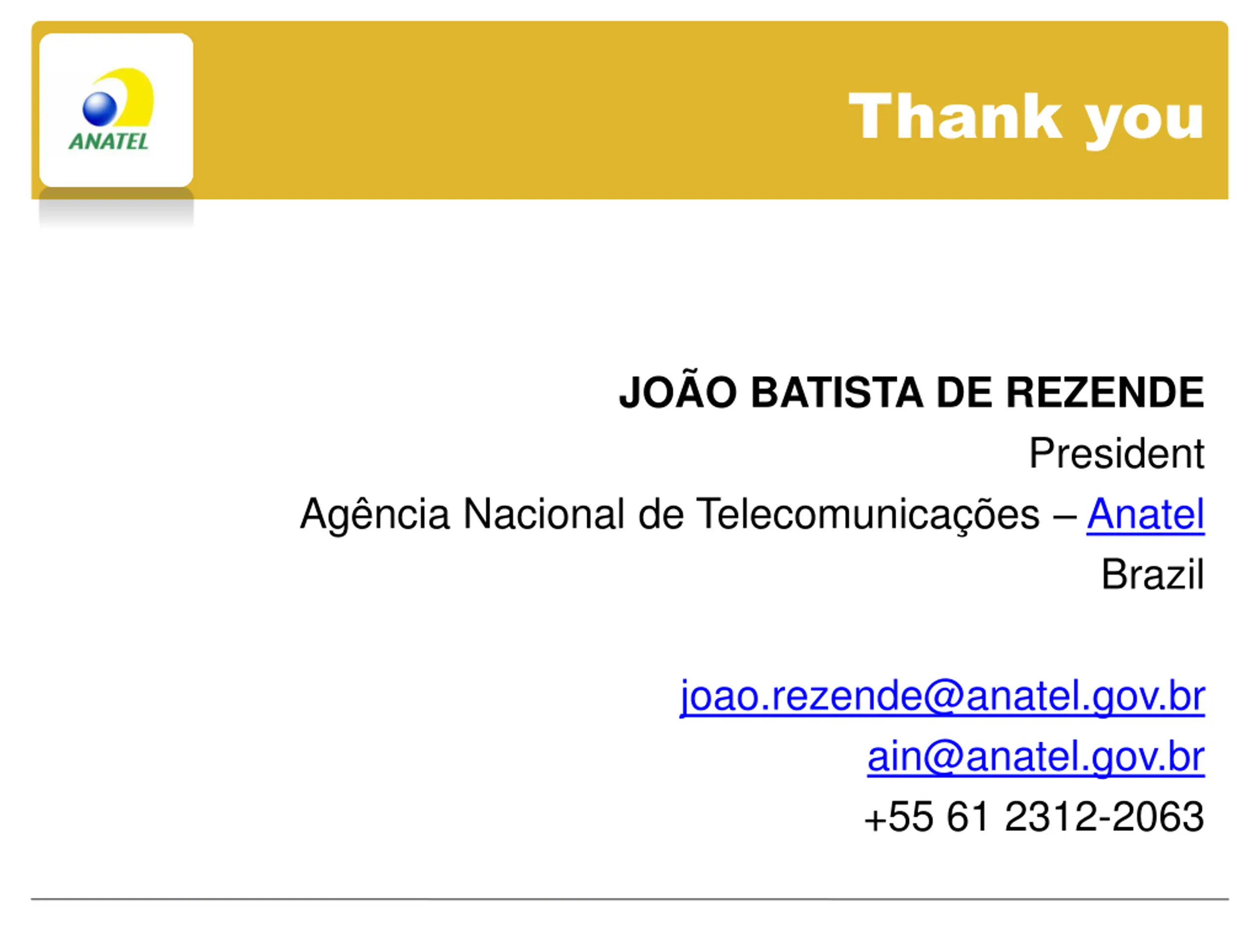 Thank you JO O BATISTA DE REZENDE President Ag ncia Nacional de Telecomunica es Anatel Brazil joao.rezende@anatel.gov.br ain@anatel.gov.br +55 61 2312-2063