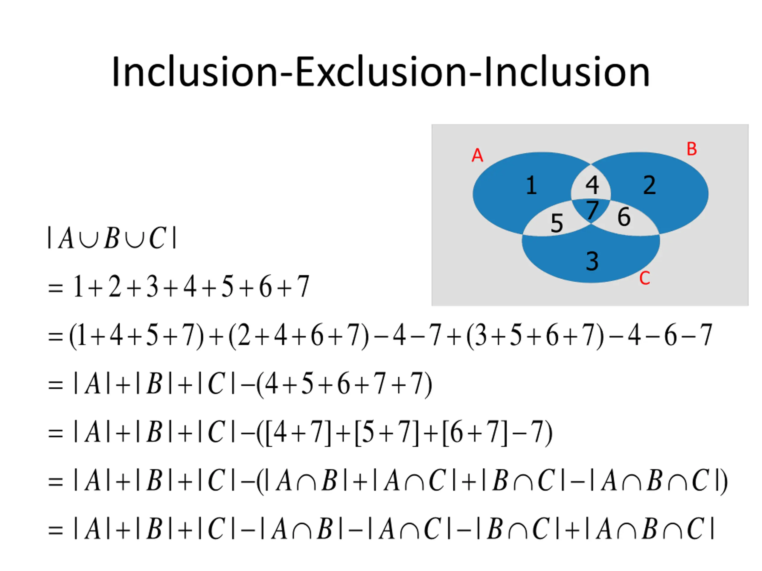 Inclusion-Exclusion-Inclusion B A 1 4 7 2 6 5 | = | + A B C 3 + + 5 + + + 1 = 2 + 3 + 4 + 6 + 7 + C 2 ( + + + + + ) 7 + 1 ( 4 + 5 B ) 7 + 4 6 ) 7 + 4 7 3 ( 5 6 4 6 7 | = + + ) 7 + | | | | | 4 ( 5 6 + 7 + A C | = + + + + + | | | | | ([ 4 A ] 7 5 [ + ] 7 A 6 [ C ] 7 B ) 7 C A B C | = + + + | | | | | (| | | | | | | |) A B C B A B C | = + + + | | | | | | | | | | | | | A B C A B A C B C A B C