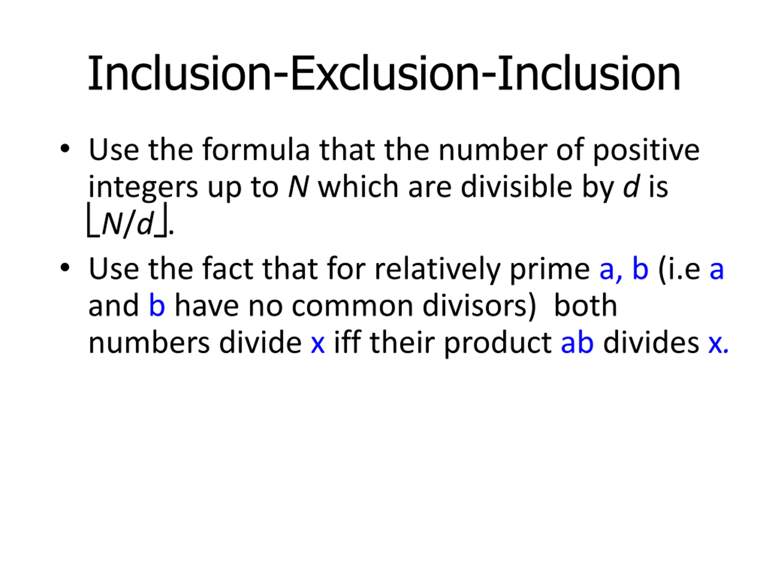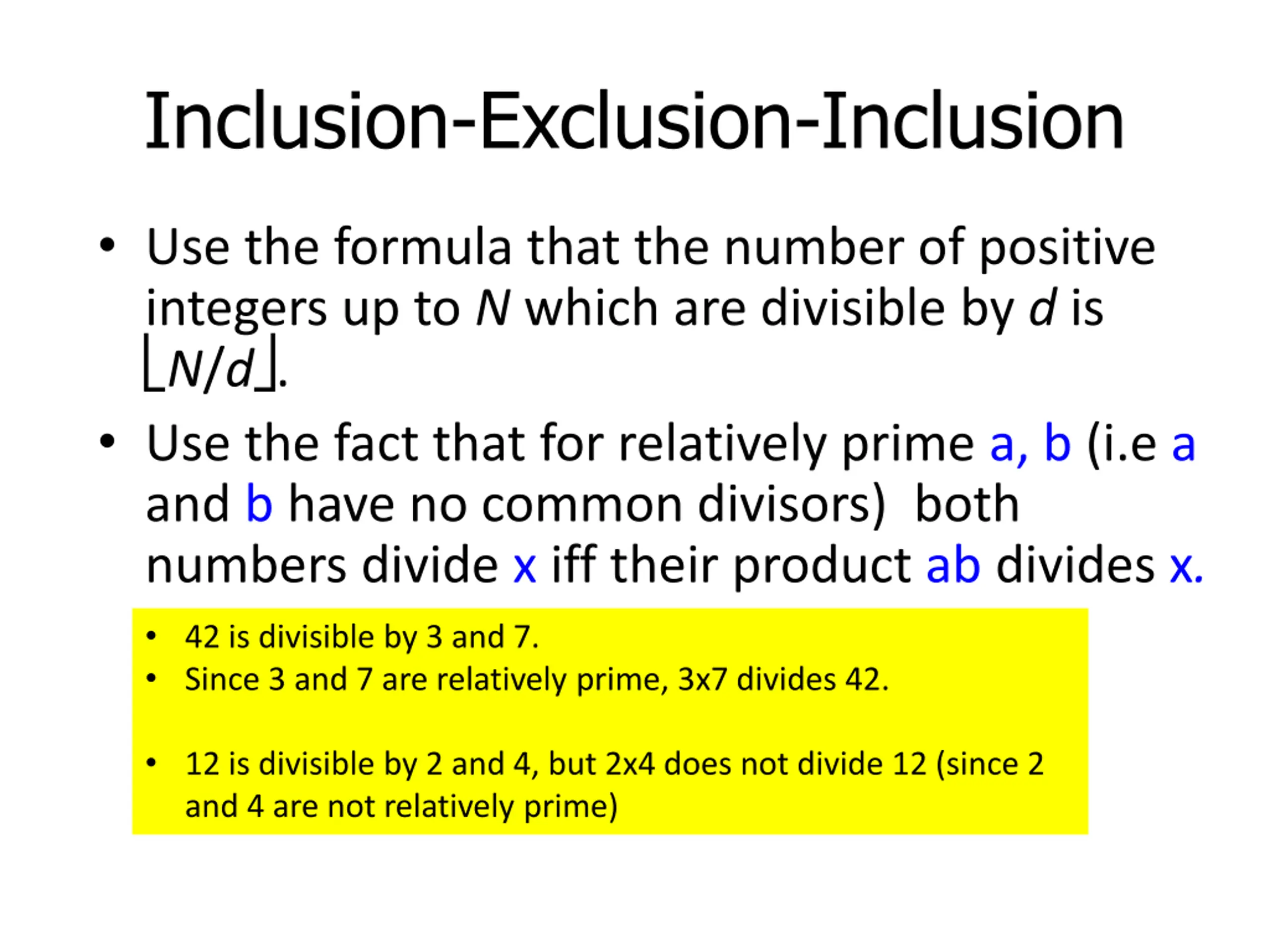 Inclusion-Exclusion-Inclusion Use the formula that the number of positive integers up to N which are divisible by d is N/d . Use the fact that for relatively prime a, b (i.e a and b have no common divisors) both numbers divide x iff their product ab divides x. 42 is divisible by 3 and 7. Since 3 and 7 are relatively prime, 3x7 divides 42. 12 is divisible by 2 and 4, but 2x4 does not divide 12 (since 2 and 4 are not relatively prime)