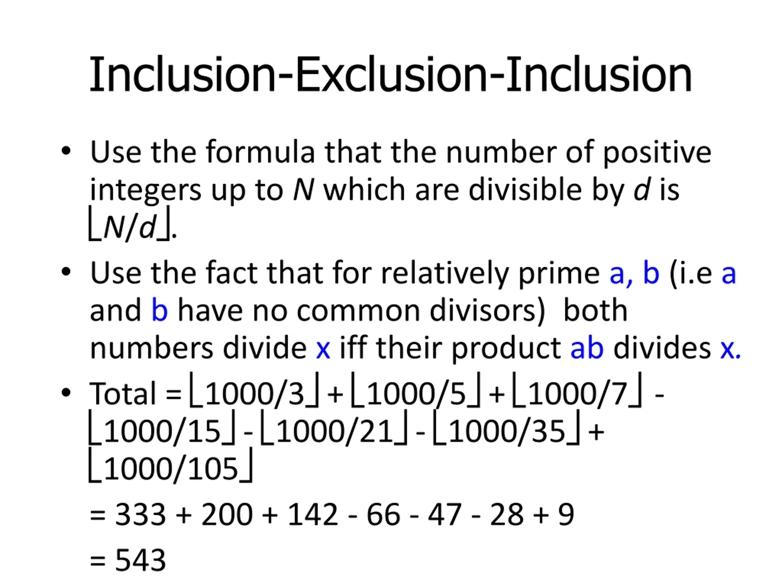 Inclusion-Exclusion-Inclusion Use the formula that the number of positive integers up to N which are divisible by d is N/d . Use the fact that for relatively prime a, b (i.e a and b have no common divisors) both numbers divide x iff their product ab divides x. Total = 1000/3 + 1000/5 + 1000/7 - 1000/15 - 1000/21 - 1000/35 + 1000/105 = 333 + 200 + 142 - 66 - 47 - 28 + 9 = 543