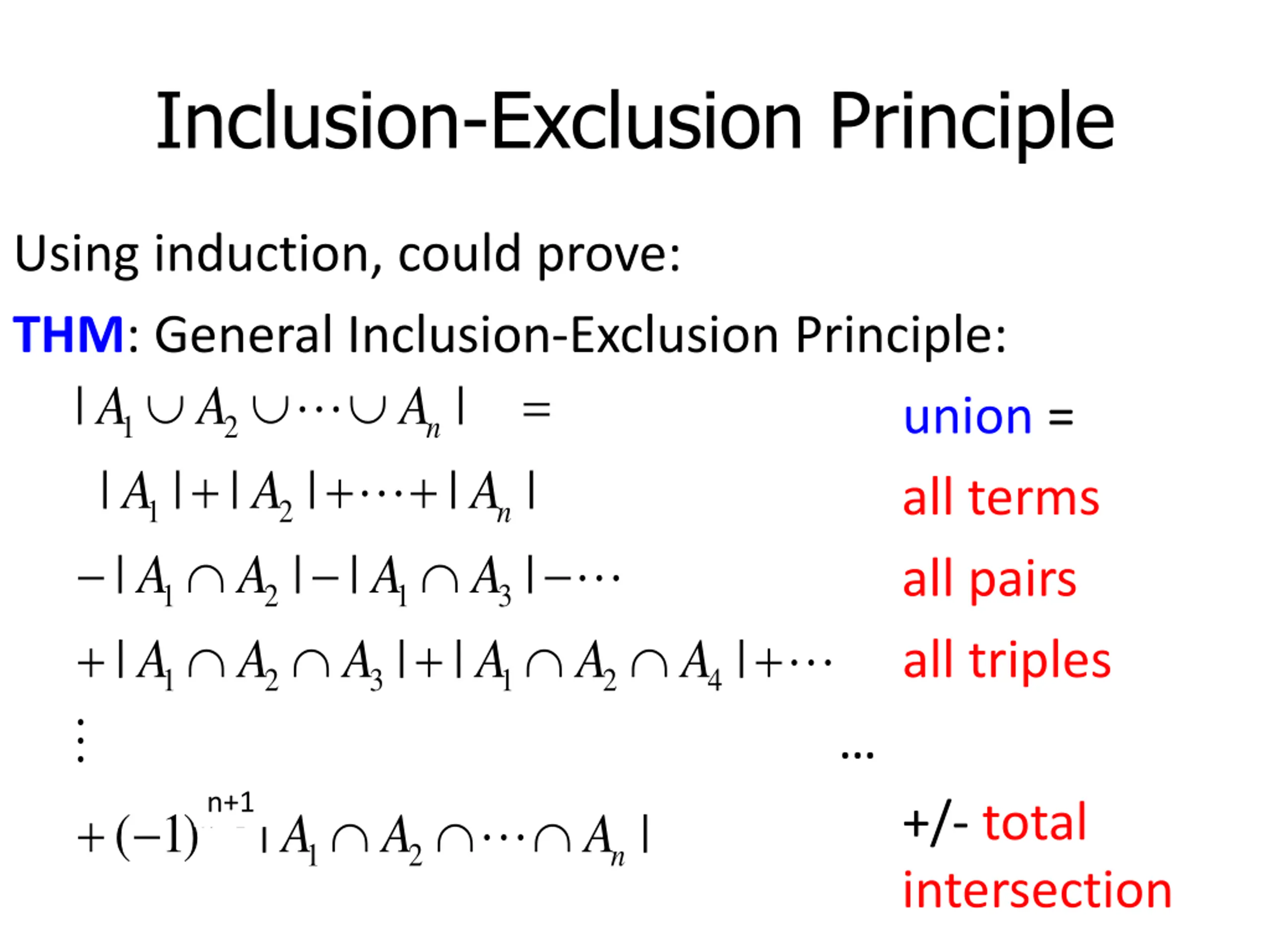 Inclusion-Exclusion Principle Using induction, could prove: THM: General Inclusion-Exclusion Principle: union = all triples intersection = | | A A A + A + 1 A 2 n + | | | | | | A all terms all pairs 1 2 n | | | | A A A A 1 2 1 3 + + + | | | | A A A A A A 1 2 3 1 2 4 n n+1 + ) 1 +/- total | n A 1 ( | A A 1 2