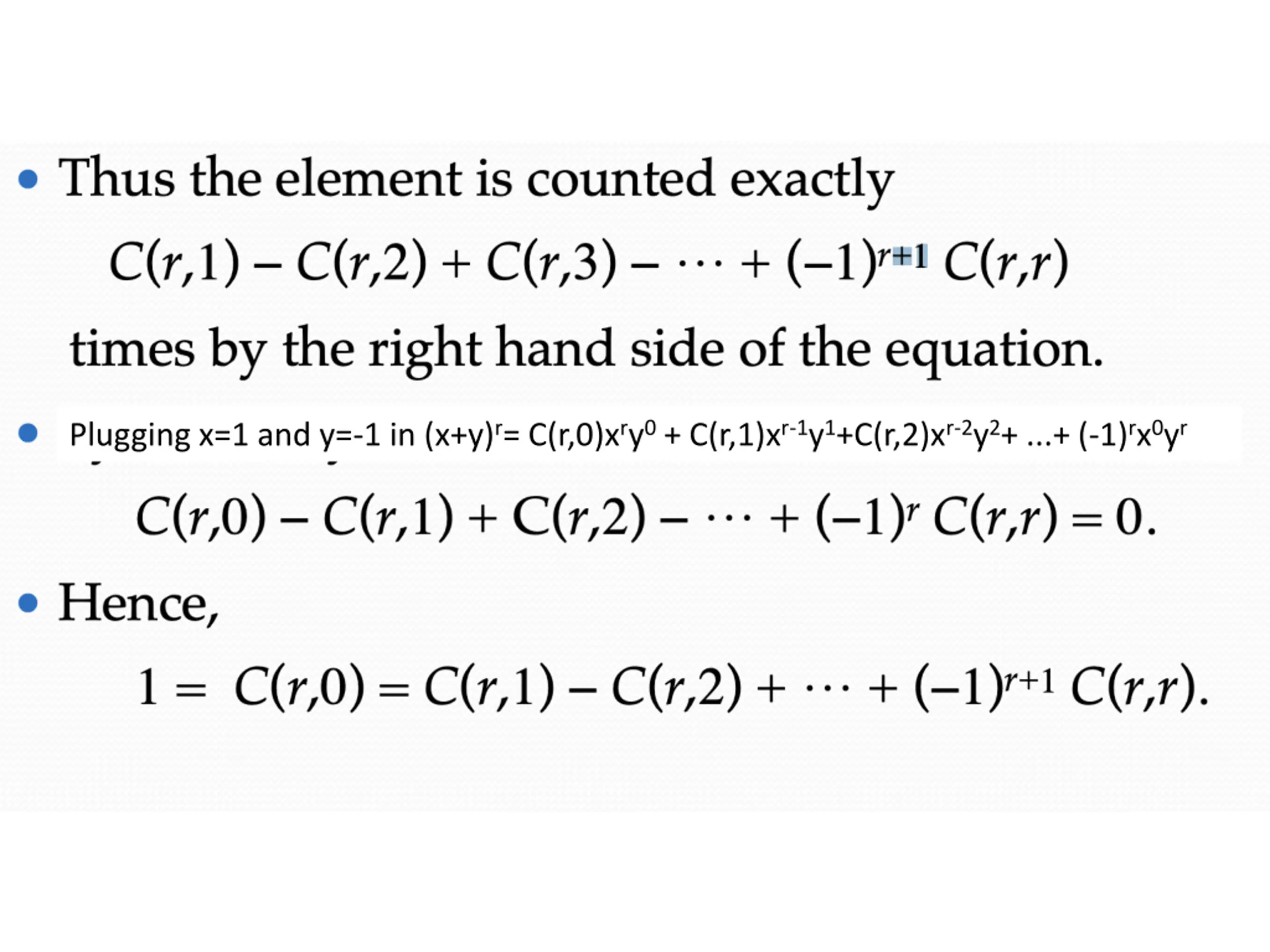 Plugging x=1 and y=-1 in (x+y)r= C(r,0)xry0 + C(r,1)xr-1y1+C(r,2)xr-2y2+ ...+ (-1)rx0yr