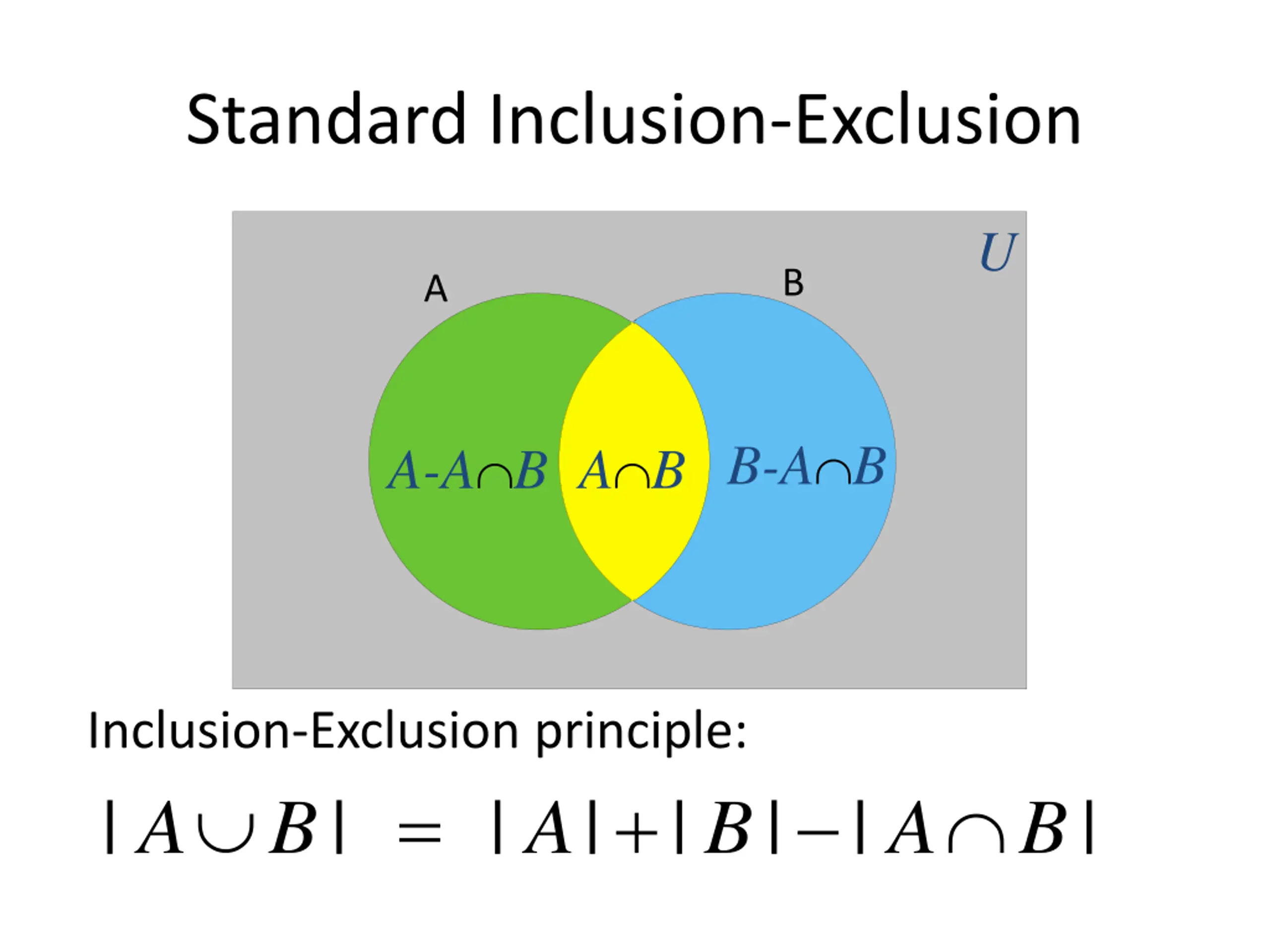 Standard Inclusion-Exclusion U B A A B B-A B A-A B Inclusion-Exclusion principle: | | B A = + | | | | | | A B A B