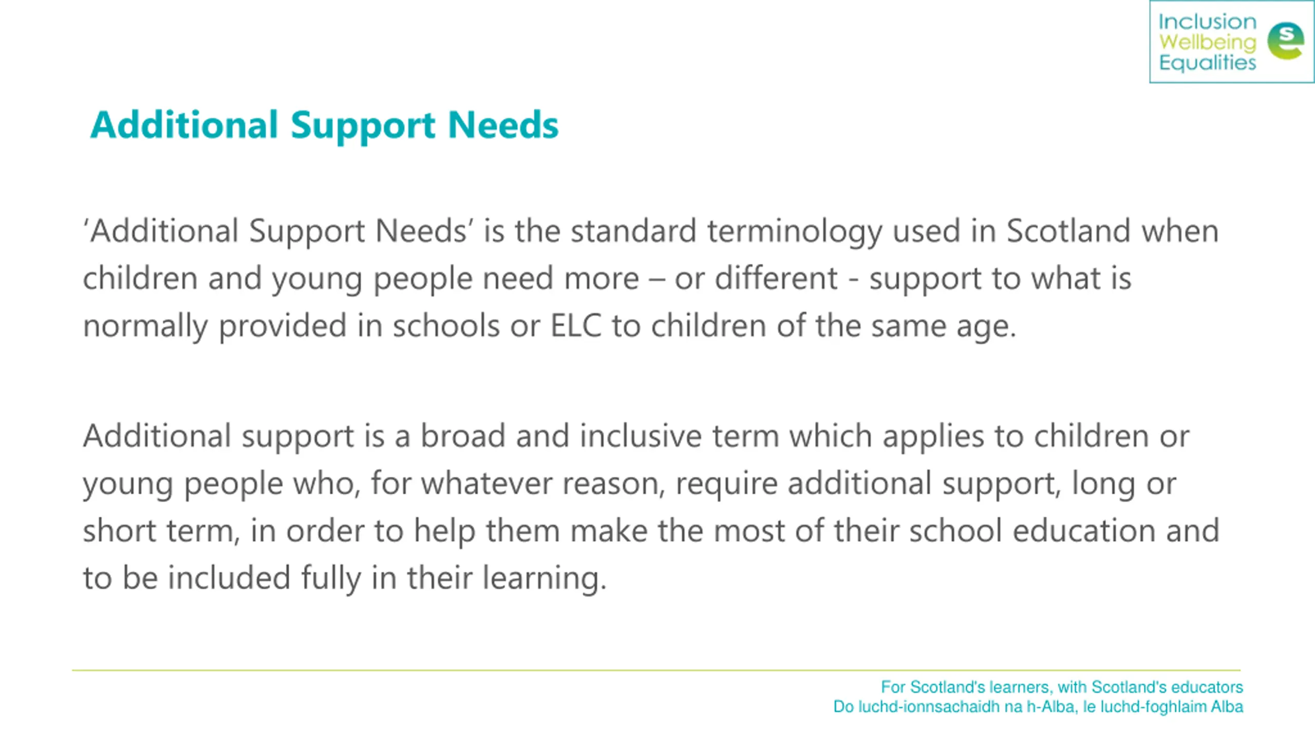 Additional Support Needs Additional Support Needs is the standard terminology used in Scotland when children and young people need more or different - support to what is normally provided in schools or ELC to children of the same age. Additional support is a broad and inclusive term which applies to children or young people who, for whatever reason, require additional support, long or short term, in order to help them make the most of their school education and to be included fully in their learning. For Scotland's learners, with Scotland's educators Do luchd-ionnsachaidh na h-Alba, le luchd-foghlaim Alba