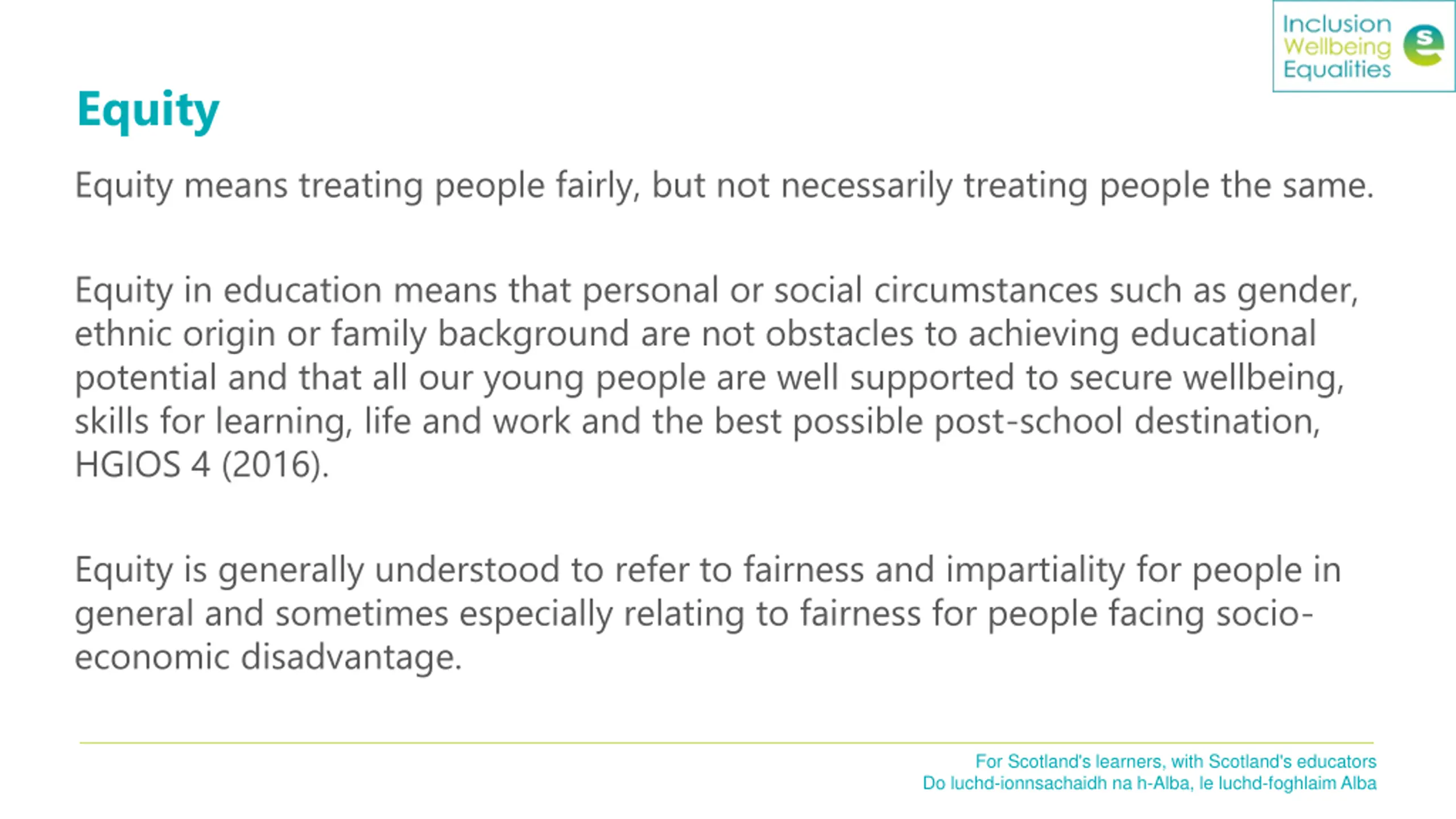 Equity Equity means treating people fairly, but not necessarily treating people the same. Equity in education means that personal or social circumstances such as gender, ethnic origin or family background are not obstacles to achieving educational potential and that all our young people are well supported to secure wellbeing, skills for learning, life and work and the best possible post-school destination, HGIOS 4 (2016). Equity is generally understood to refer to fairness and impartiality for people in general and sometimes especially relating to fairness for people facing socio- economic disadvantage. For Scotland's learners, with Scotland's educators Do luchd-ionnsachaidh na h-Alba, le luchd-foghlaim Alba