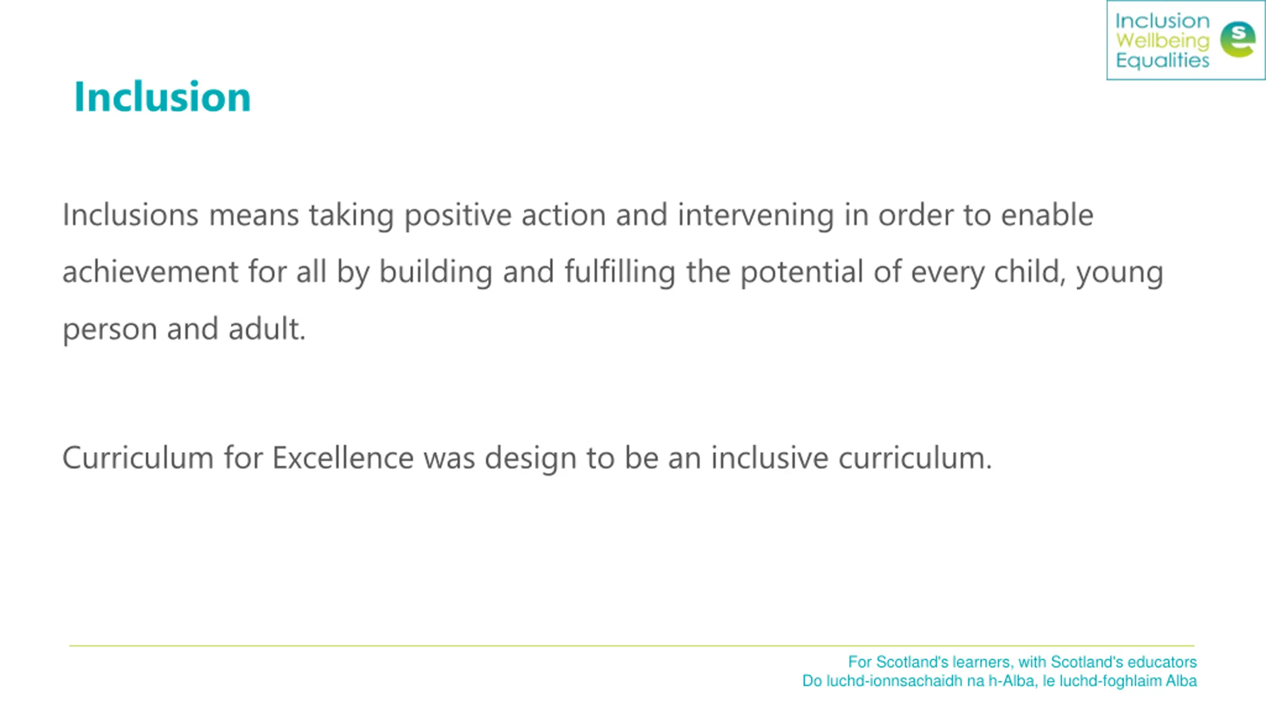 Inclusion Inclusions means taking positive action and intervening in order to enable achievement for all by building and fulfilling the potential of every child, young person and adult. Curriculum for Excellence was design to be an inclusive curriculum. For Scotland's learners, with Scotland's educators Do luchd-ionnsachaidh na h-Alba, le luchd-foghlaim Alba