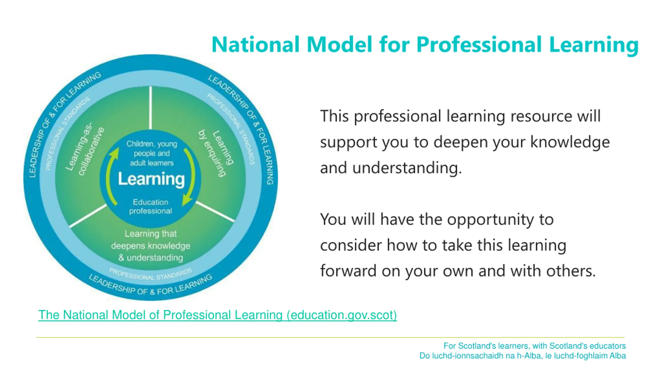 National Model for Professional Learning This professional learning resource will support you to deepen your knowledge and understanding. You will have the opportunity to consider how to take this learning forward on your own and with others. The National Model of Professional Learning (education.gov.scot) For Scotland's learners, with Scotland's educators Do luchd-ionnsachaidh na h-Alba, le luchd-foghlaim Alba