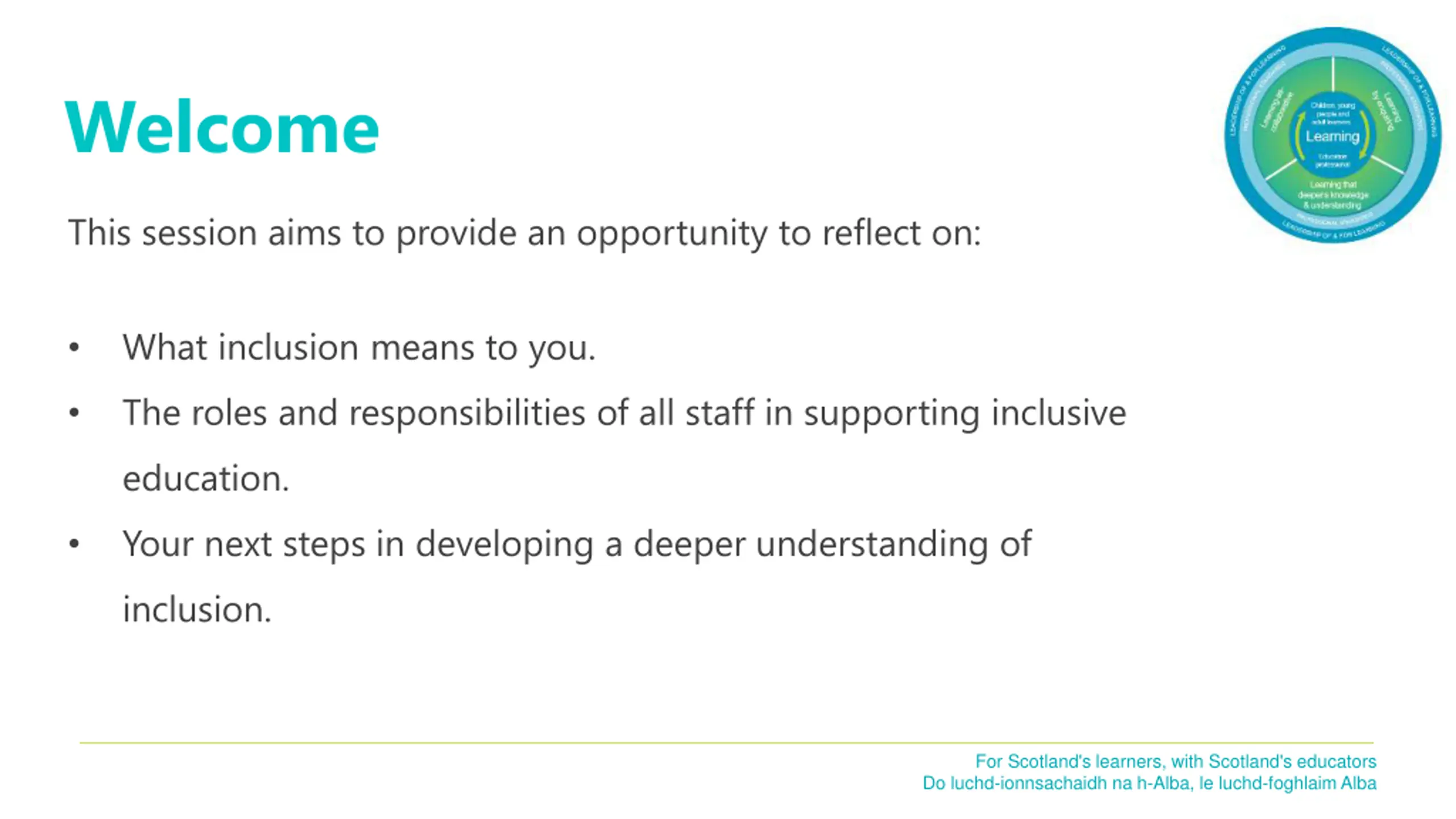 Pause for Thought Welcome This session aims to provide an opportunity to reflect on: What inclusion means to you. The roles and responsibilities of all staff in supporting inclusive education. Your next steps in developing a deeper understanding of inclusion. For Scotland's learners, with Scotland's educators Do luchd-ionnsachaidh na h-Alba, le luchd-foghlaim Alba