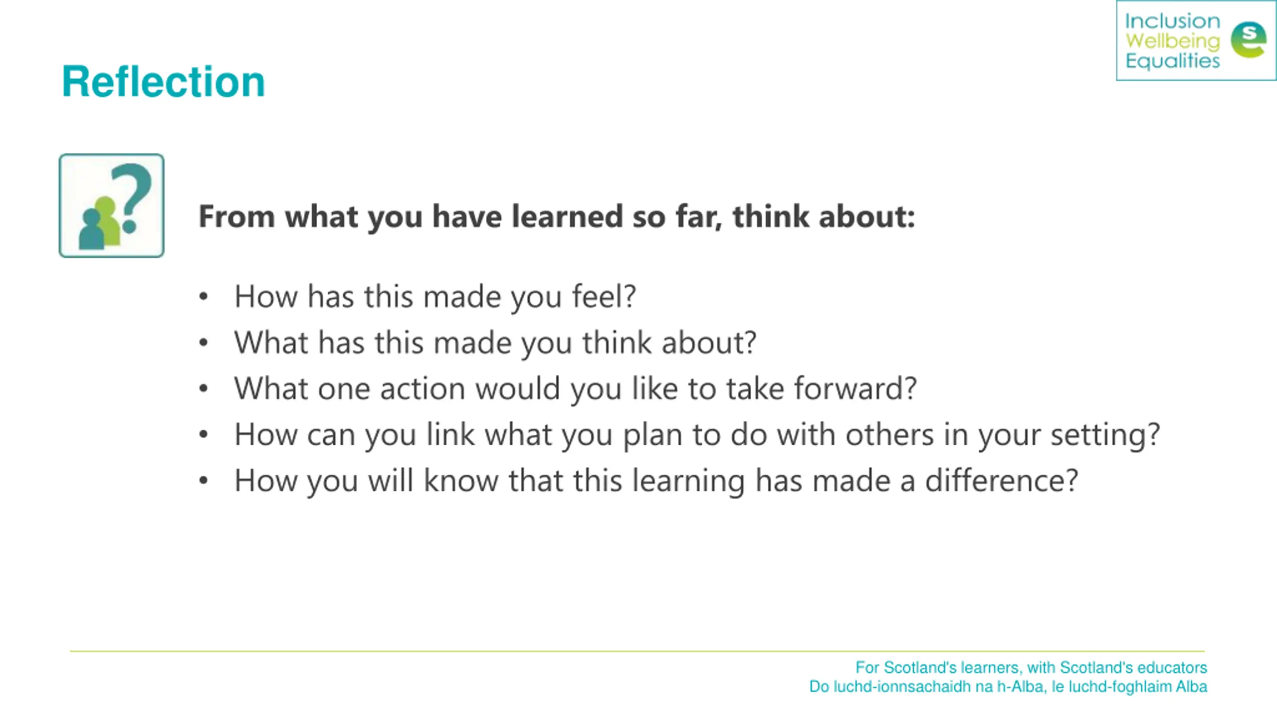 Reflection From what you have learned so far, think about: How has this made you feel? What has this made you think about? What one action would you like to take forward? How can you link what you plan to do with others in your setting? How you will know that this learning has made a difference? For Scotland's learners, with Scotland's educators Do luchd-ionnsachaidh na h-Alba, le luchd-foghlaim Alba