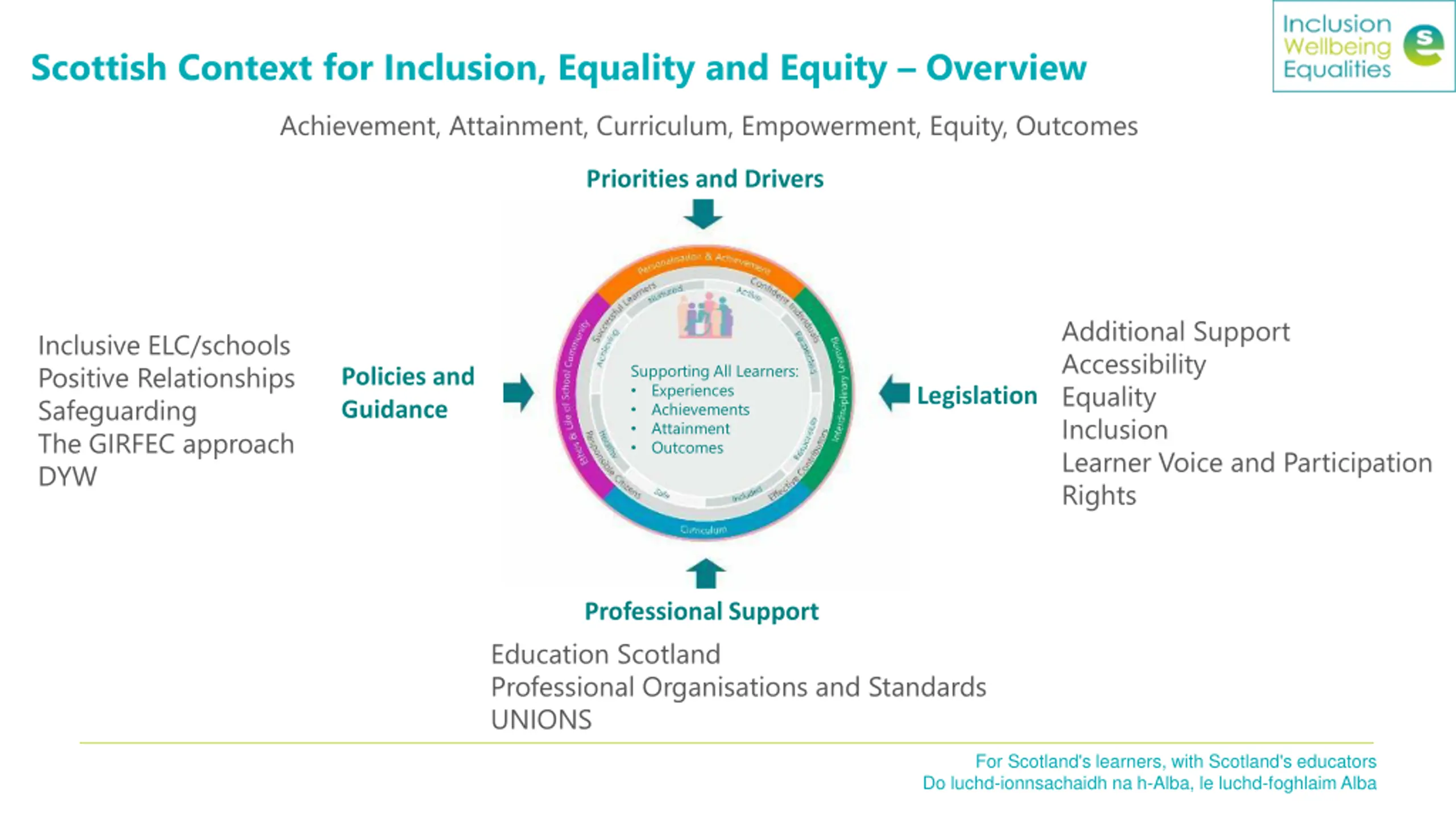 Scottish Context for Inclusion, Equality and Equity Overview Achievement, Attainment, Curriculum, Empowerment, Equity, Outcomes Priorities and Drivers Additional Support Accessibility Equality Inclusion Learner Voice and Participation Rights Inclusive ELC/schools Positive Relationships Safeguarding The GIRFEC approach DYW Supporting All Learners: Experiences Achievements Attainment Outcomes Policies and Guidance Legislation Professional Support Education Scotland Professional Organisations and Standards UNIONS For Scotland's learners, with Scotland's educators Do luchd-ionnsachaidh na h-Alba, le luchd-foghlaim Alba