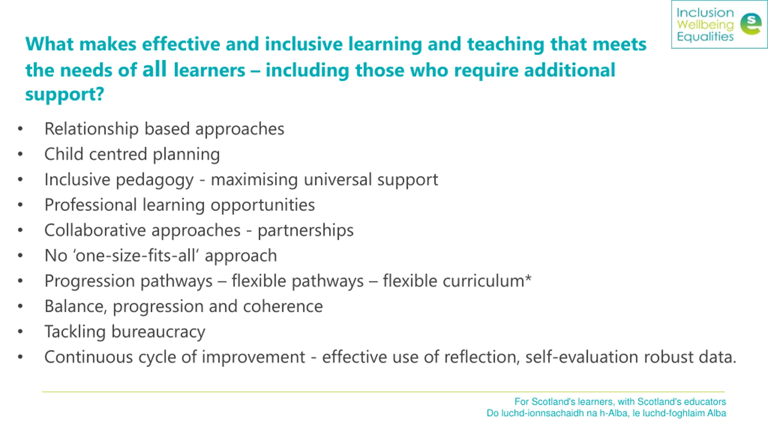 What makes effective and inclusive learning and teaching that meets the needs of all learners including those who require additional support? Relationship based approaches Child centred planning Inclusive pedagogy - maximising universal support Professional learning opportunities Collaborative approaches - partnerships No one-size-fits-all approach Progression pathways flexible pathways flexible curriculum* Balance, progression and coherence Tackling bureaucracy Continuous cycle of improvement - effective use of reflection, self-evaluation robust data. For Scotland's learners, with Scotland's educators Do luchd-ionnsachaidh na h-Alba, le luchd-foghlaim Alba