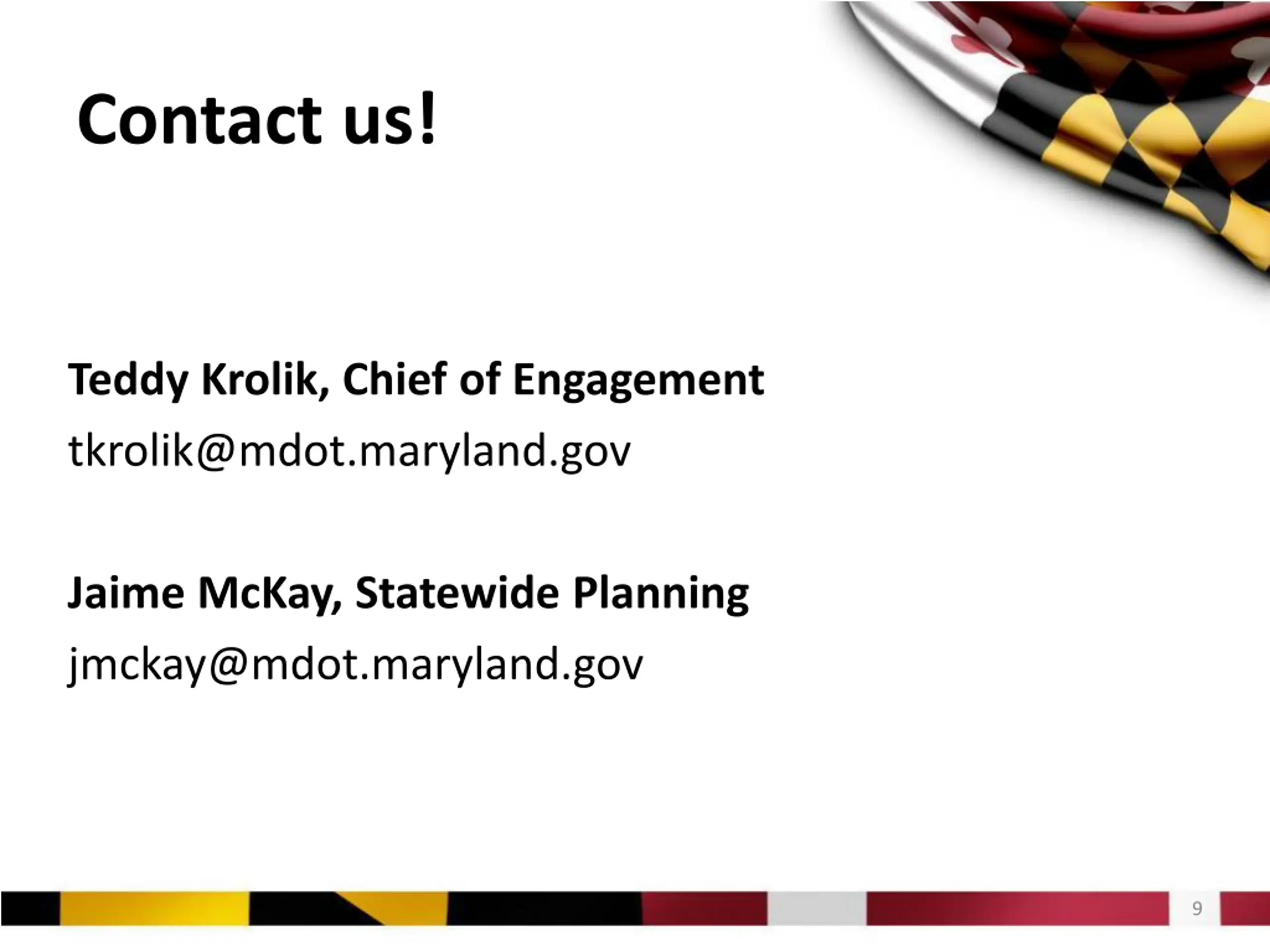 Contact us! Teddy Krolik, Chief of Engagement tkrolik@mdot.maryland.gov Jaime McKay, Statewide Planning jmckay@mdot.maryland.gov 9