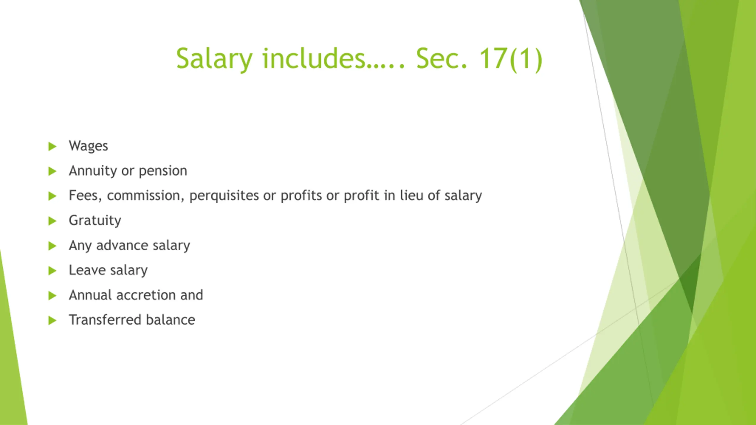 Salary includes.. Sec. 17(1) Wages Annuity or pension Fees, commission, perquisites or profits or profit in lieu of salary Gratuity Any advance salary Leave salary Annual accretion and Transferred balance