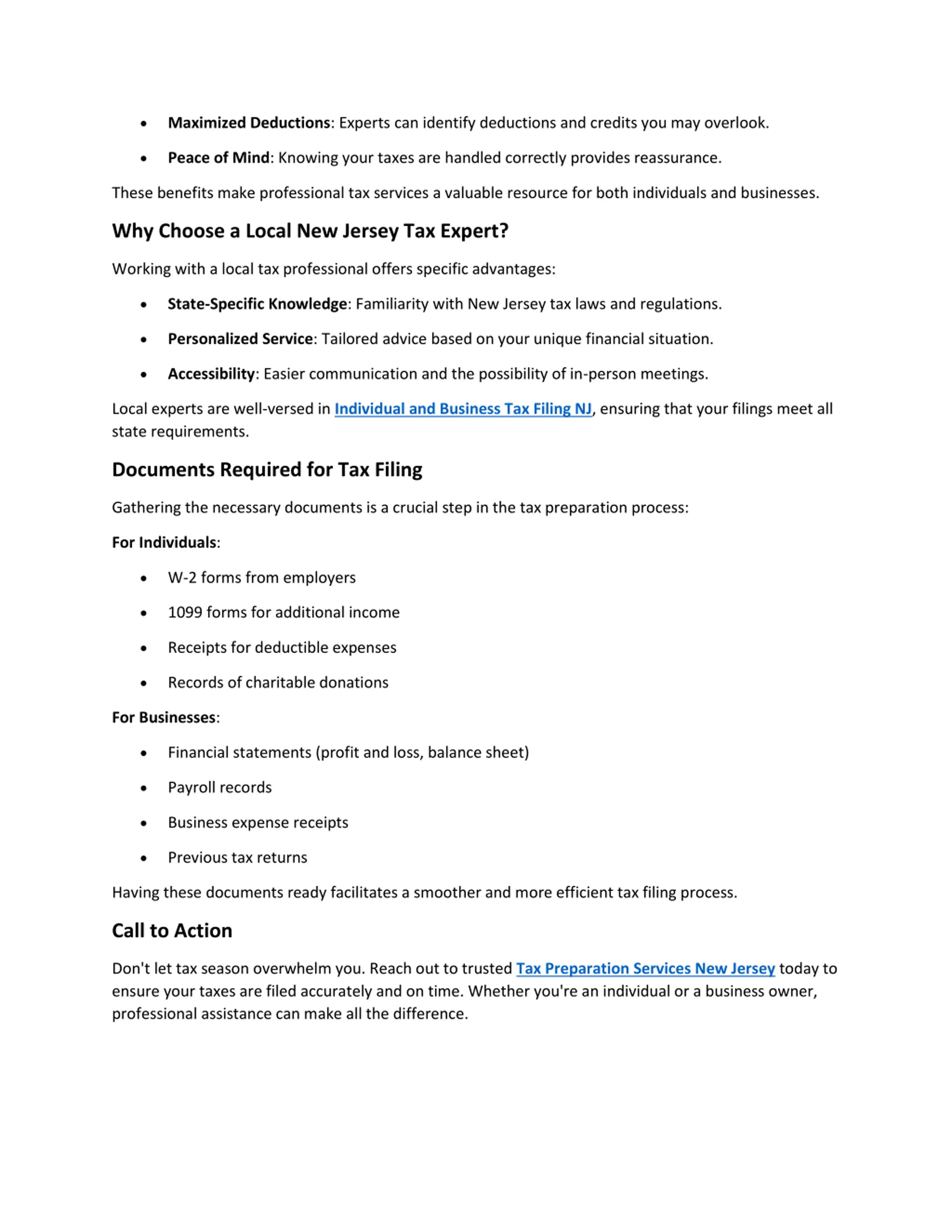 Maximized Deductions: Experts can identify deductions and credits you may overlook. Peace of Mind: Knowing your taxes are handled correctly provides reassurance. These benefits make professional tax services a valuable resource for both individuals and businesses. Why Choose a Local New Jersey Tax Expert? Working with a local tax professional offers specific advantages: State-Specific Knowledge: Familiarity with New Jersey tax laws and regulations. Personalized Service: Tailored advice based on your unique financial situation. Accessibility: Easier communication and the possibility of in-person meetings. Local experts are well-versed in Individual and Business Tax Filing NJ, ensuring that your filings meet all state requirements. Documents Required for Tax Filing Gathering the necessary documents is a crucial step in the tax preparation process: For Individuals: W-2 forms from employers 1099 forms for additional income Receipts for deductible expenses Records of charitable donations For Businesses: Financial statements (profit and loss, balance sheet) Payroll records Business expense receipts Previous tax returns Having these documents ready facilitates a smoother and more efficient tax filing process. Call to Action Don't let tax season overwhelm you. Reach out to trusted Tax Preparation Services New Jersey today to ensure your taxes are filed accurately and on time. Whether you're an individual or a business owner, professional assistance can make all the difference.