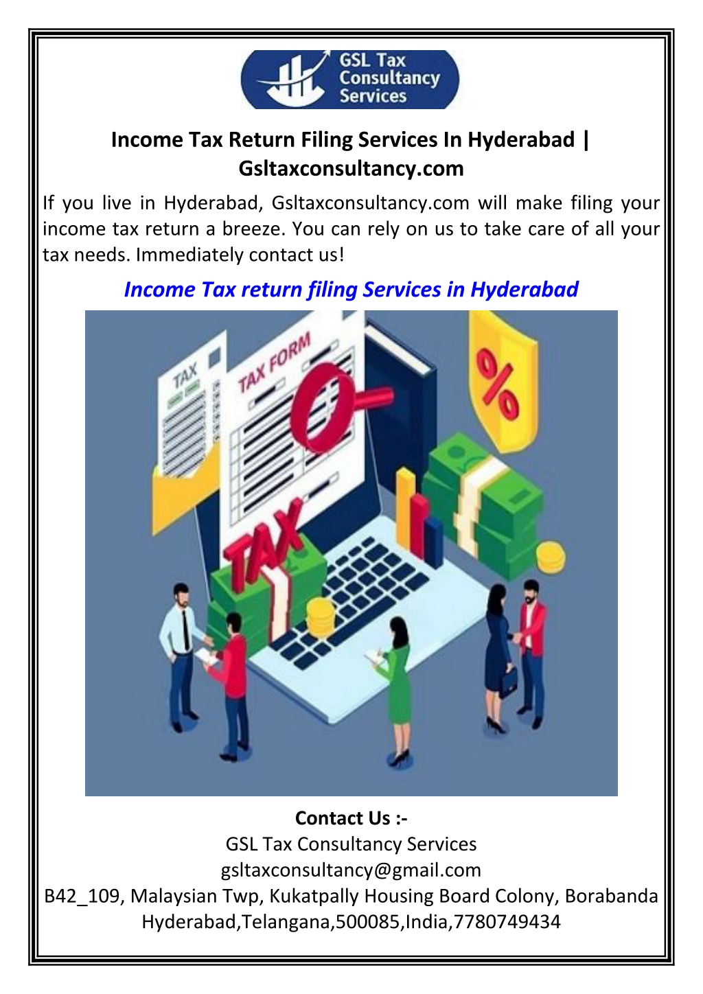 Income Tax Return Filing Services In Hyderabad | Gsltaxconsultancy.com If you live in Hyderabad, Gsltaxconsultancy.com will make filing your income tax return a breeze. You can rely on us to take care of all your tax needs. Immediately contact us! Income Tax return filing Services in Hyderabad Contact Us :- GSL Tax Consultancy Services gsltaxconsultancy@gmail.com B42_109, Malaysian Twp, Kukatpally Housing Board Colony, Borabanda Hyderabad,Telangana,500085,India,7780749434