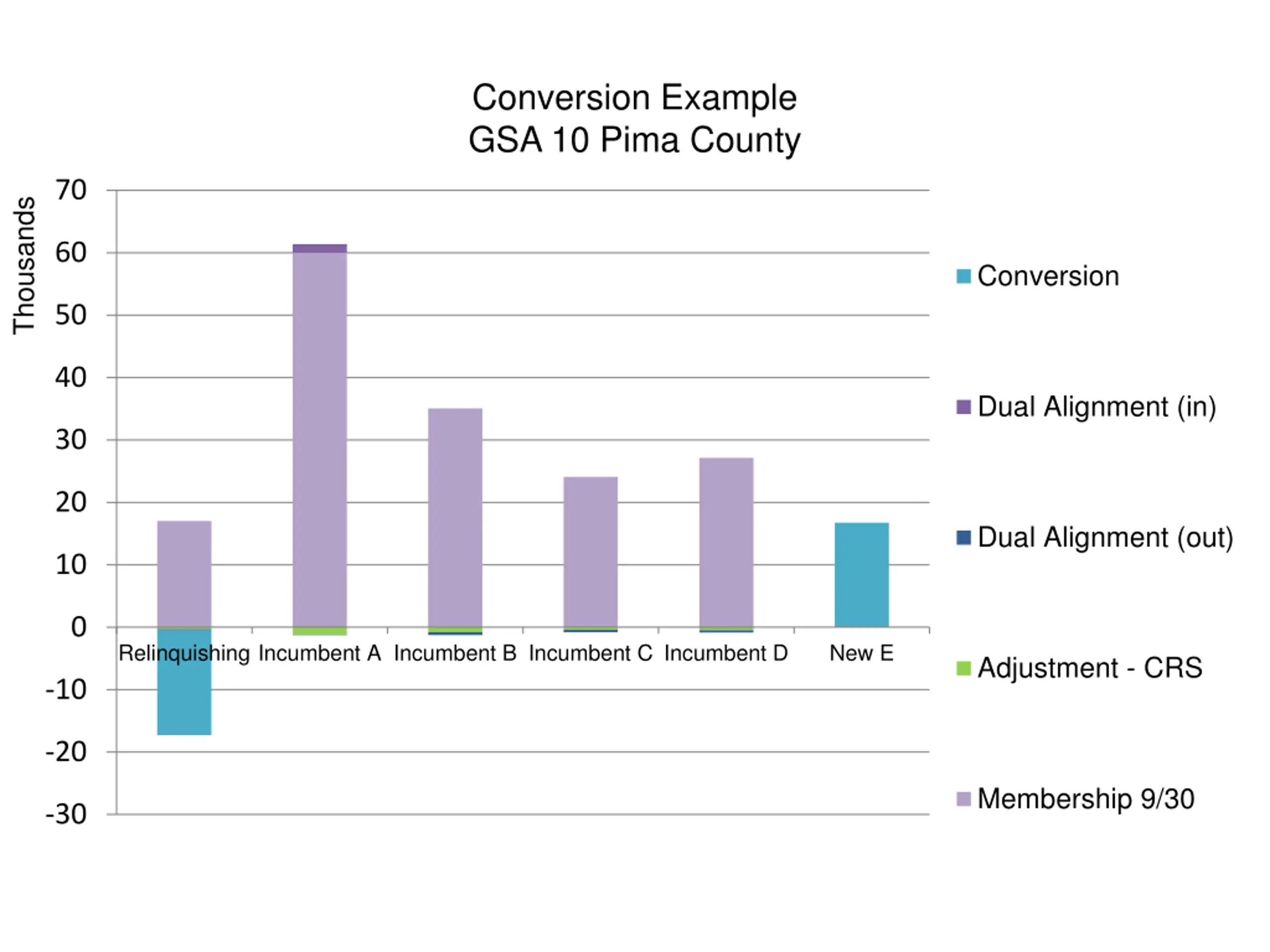 Conversion Example GSA 10 Pima County 70 Thousands 60 Conversion 50 40 Dual Alignment (in) 30 20 Dual Alignment (out) 10 0 Relinquishing Incumbent A Incumbent B Incumbent C Incumbent D New E Adjustment - CRS -10 -20 Membership 9/30 -30