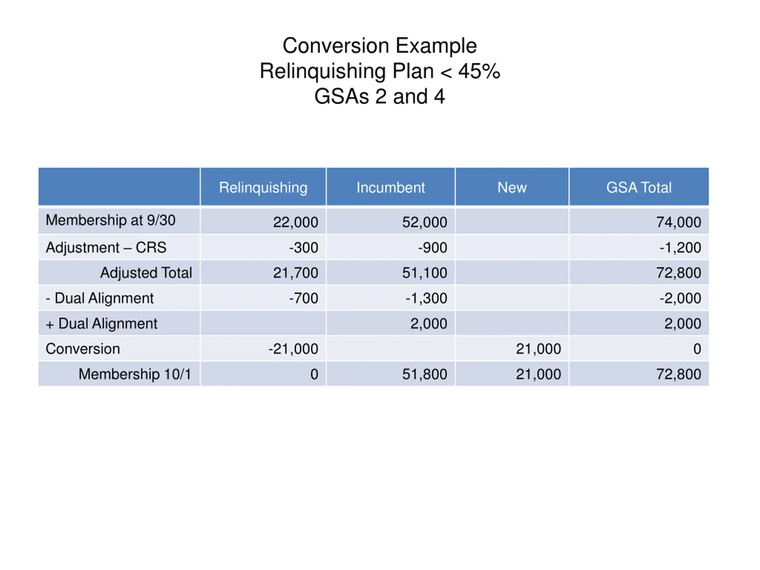 Conversion Example Relinquishing Plan < 45% GSAs 2 and 4 Relinquishing Incumbent New GSA Total Membership at 9/30 22,000 52,000 74,000 Adjustment CRS -300 -900 -1,200 Adjusted Total 21,700 51,100 72,800 - Dual Alignment -700 -1,300 -2,000 + Dual Alignment 2,000 2,000 Conversion -21,000 21,000 0 Membership 10/1 0 51,800 21,000 72,800