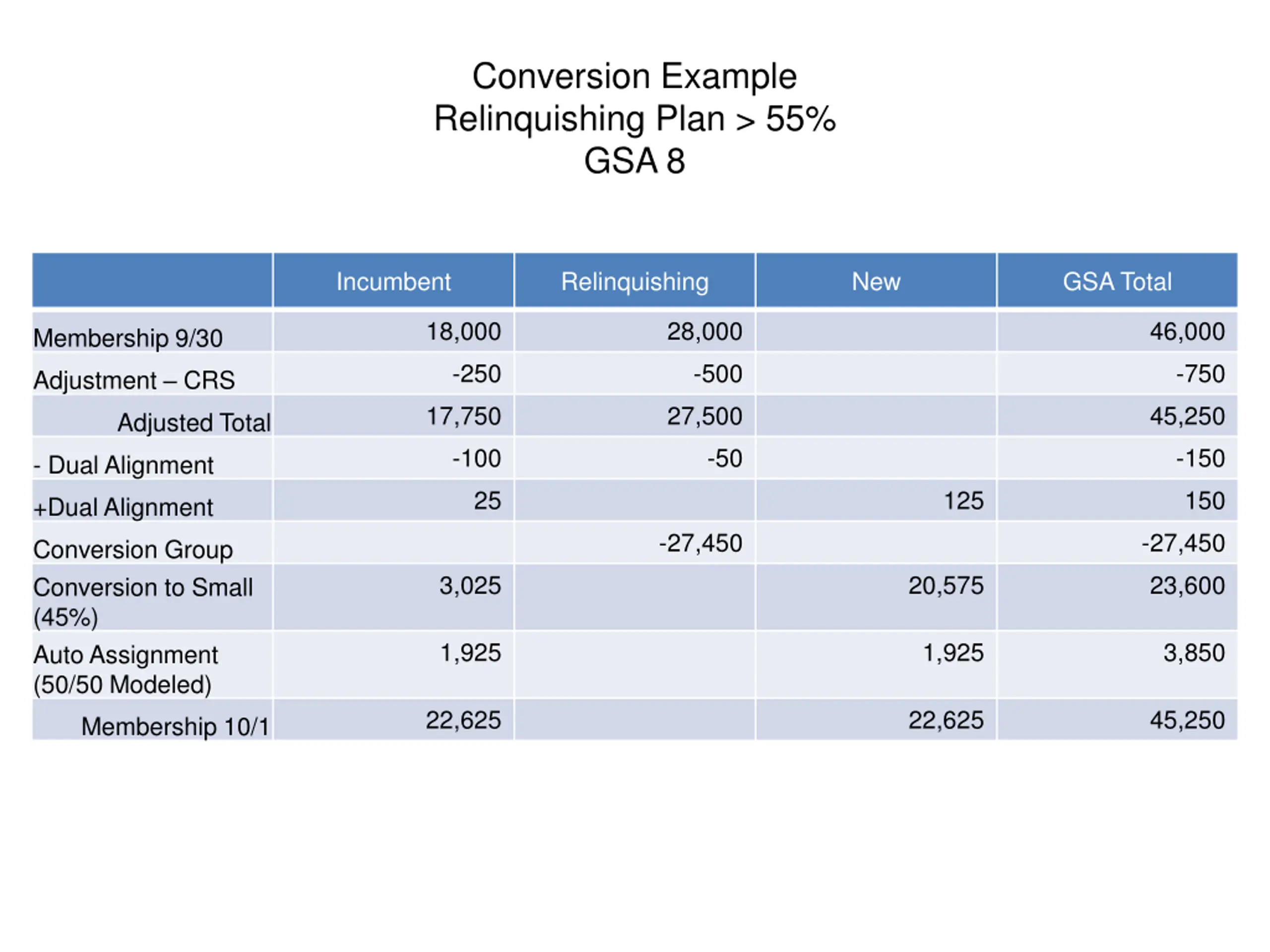 Conversion Example Relinquishing Plan > 55% GSA 8 Incumbent Relinquishing New GSA Total 18,000 28,000 46,000 Membership 9/30 -250 -500 -750 Adjustment CRS 17,750 27,500 45,250 Adjusted Total -100 -50 -150 - Dual Alignment 25 125 150 +Dual Alignment -27,450 -27,450 Conversion Group Conversion to Small (45%) Auto Assignment (50/50 Modeled) 3,025 20,575 23,600 1,925 1,925 3,850 22,625 22,625 45,250 Membership 10/1