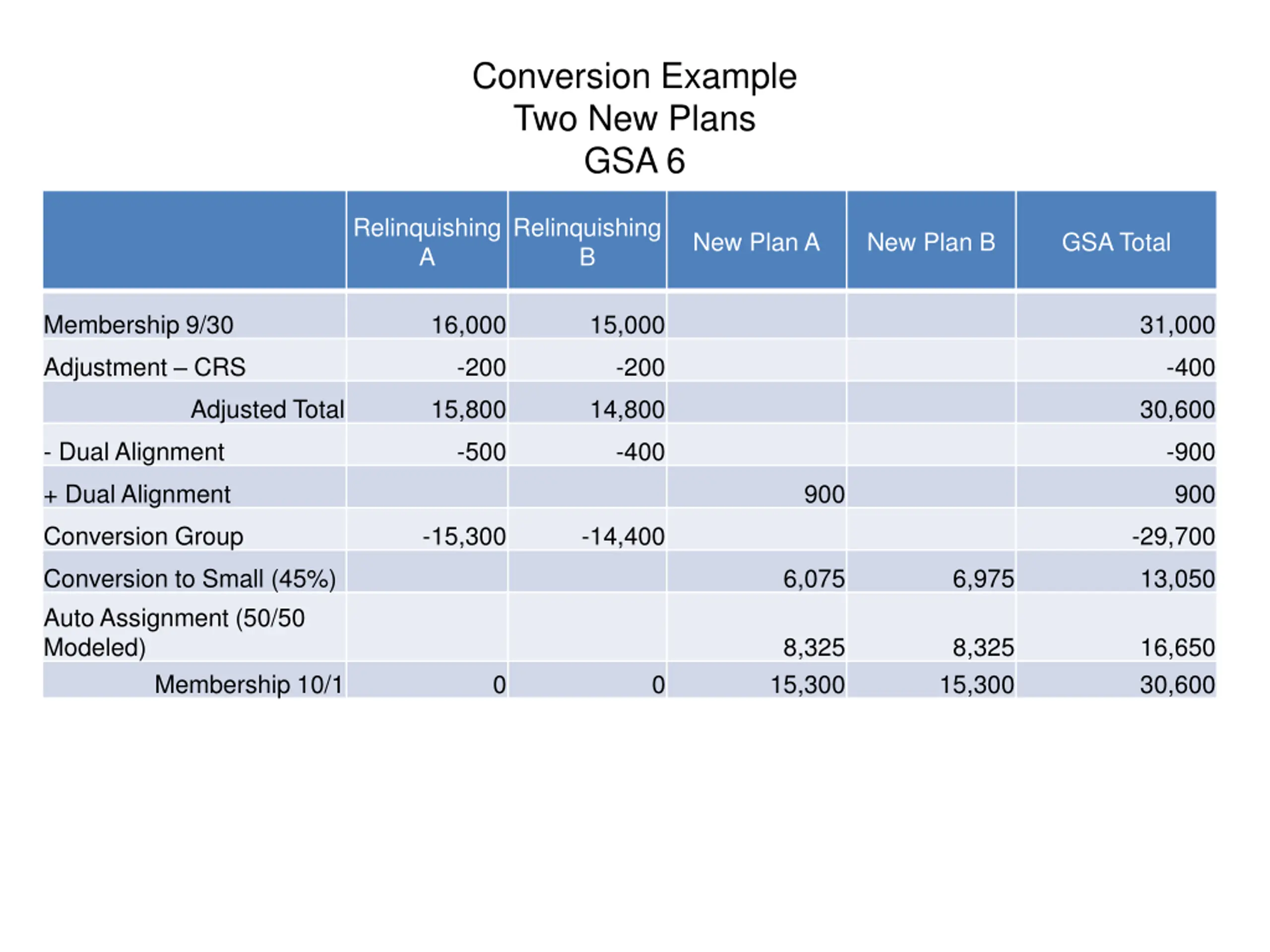 Conversion Example Two New Plans GSA 6 20 Thousands Auto Assignment (50/50 Modeled) Conversion to Small (45%) 10 Conversion Group Dual Alignment (in) 0 Relinquishing A Relinquishing B New Plan A New Plan B Dual Alignment (out) -10 Adjustment - CRS Membership 9/30 -20