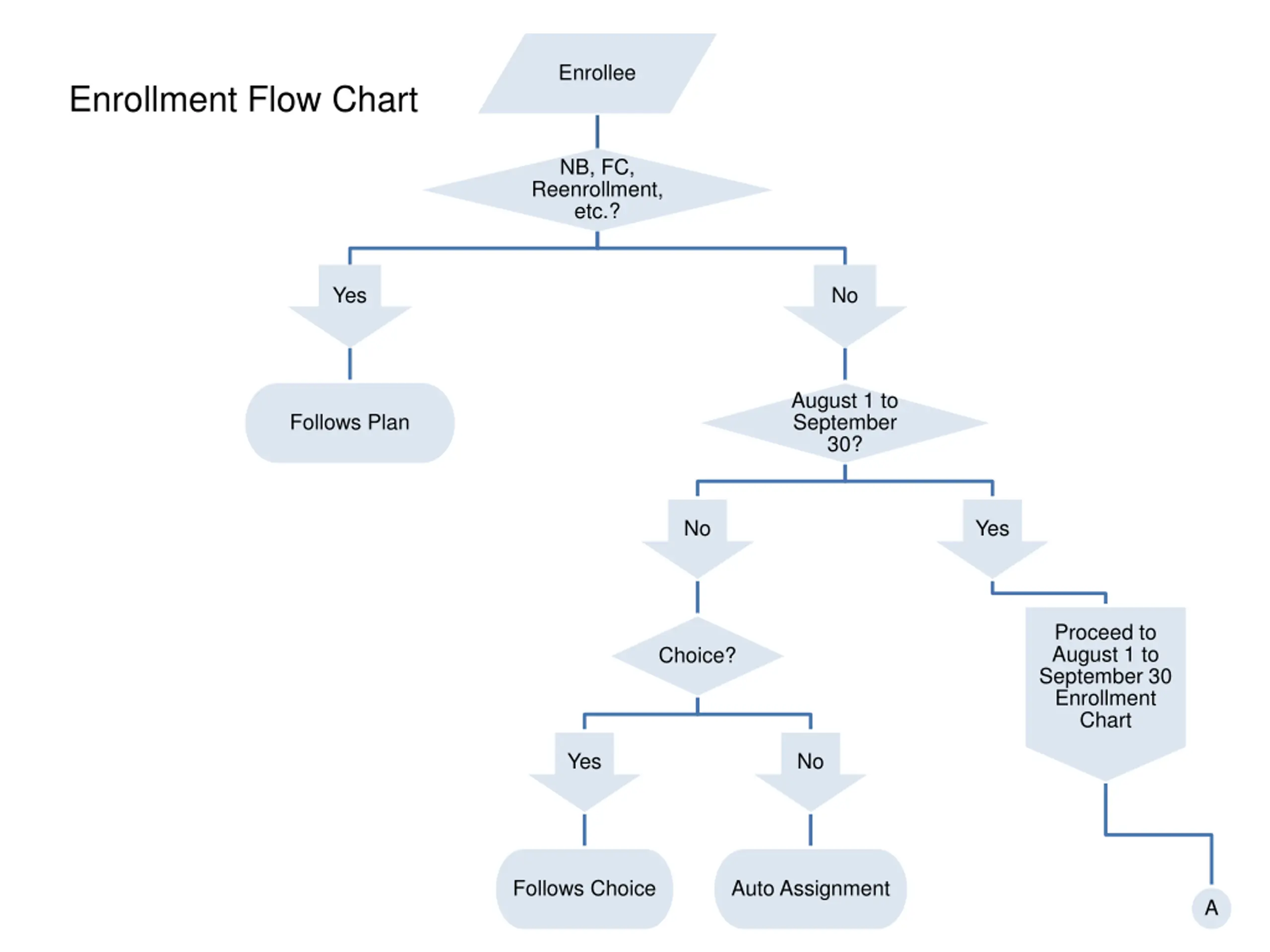 Enrollee Enrollment Flow Chart NB, FC, Reenrollment, etc.? Yes No August 1 to September 30? Follows Plan No Yes Proceed to August 1 to September 30 Enrollment Chart Choice? Yes No Follows Choice Auto Assignment A