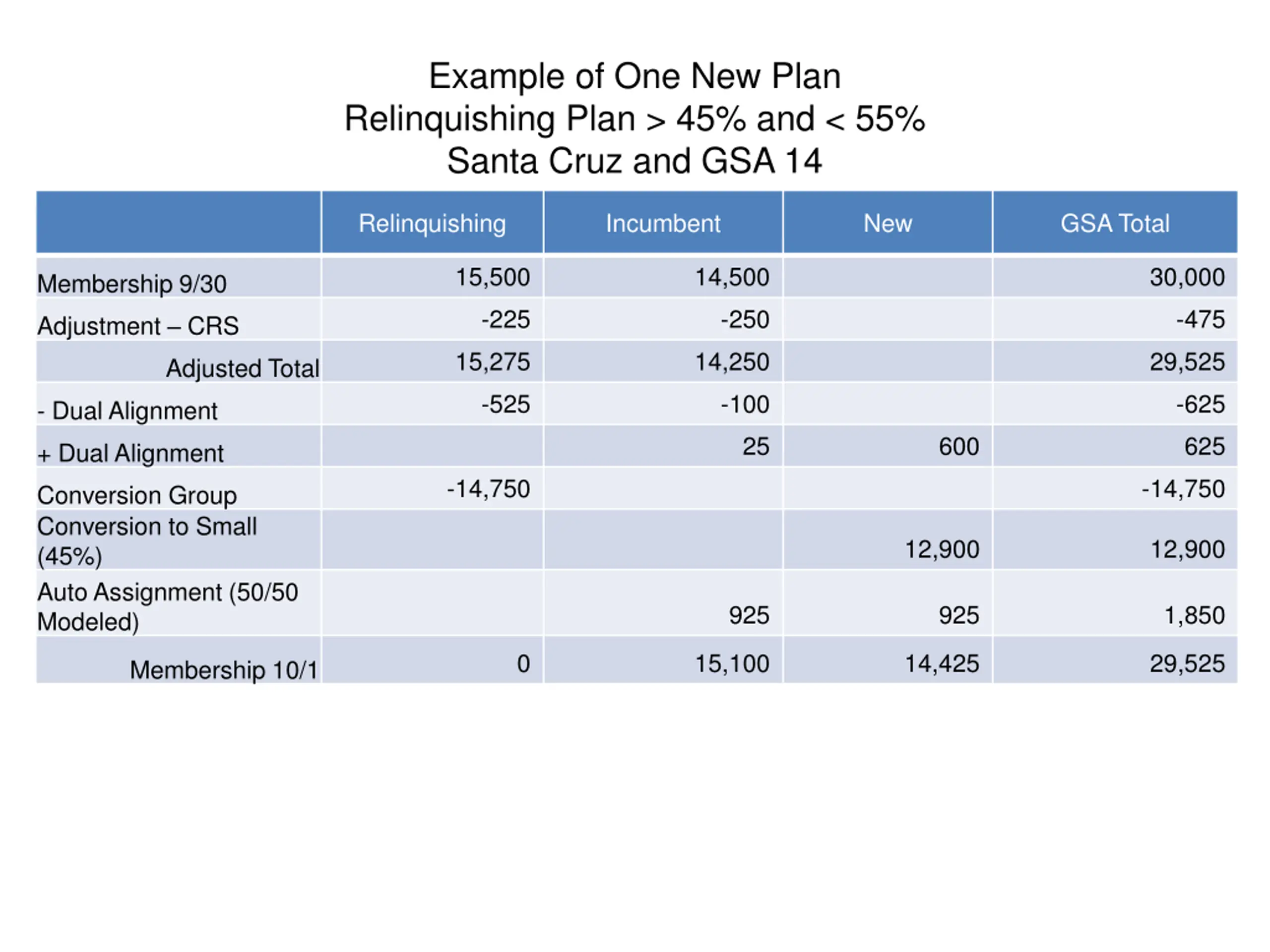 Example of One New Plan Relinquishing Plan > 45% and < 55% Santa Cruz and GSA 14 20 Thousands Auto Assignment Conversion to Small (45%) 10 Conversion Group 0 Relinquishing Incumbent New Dual Alignment (in) Dual Alignment (out) -10 Adjustment - CRS -20 Membership 9/30