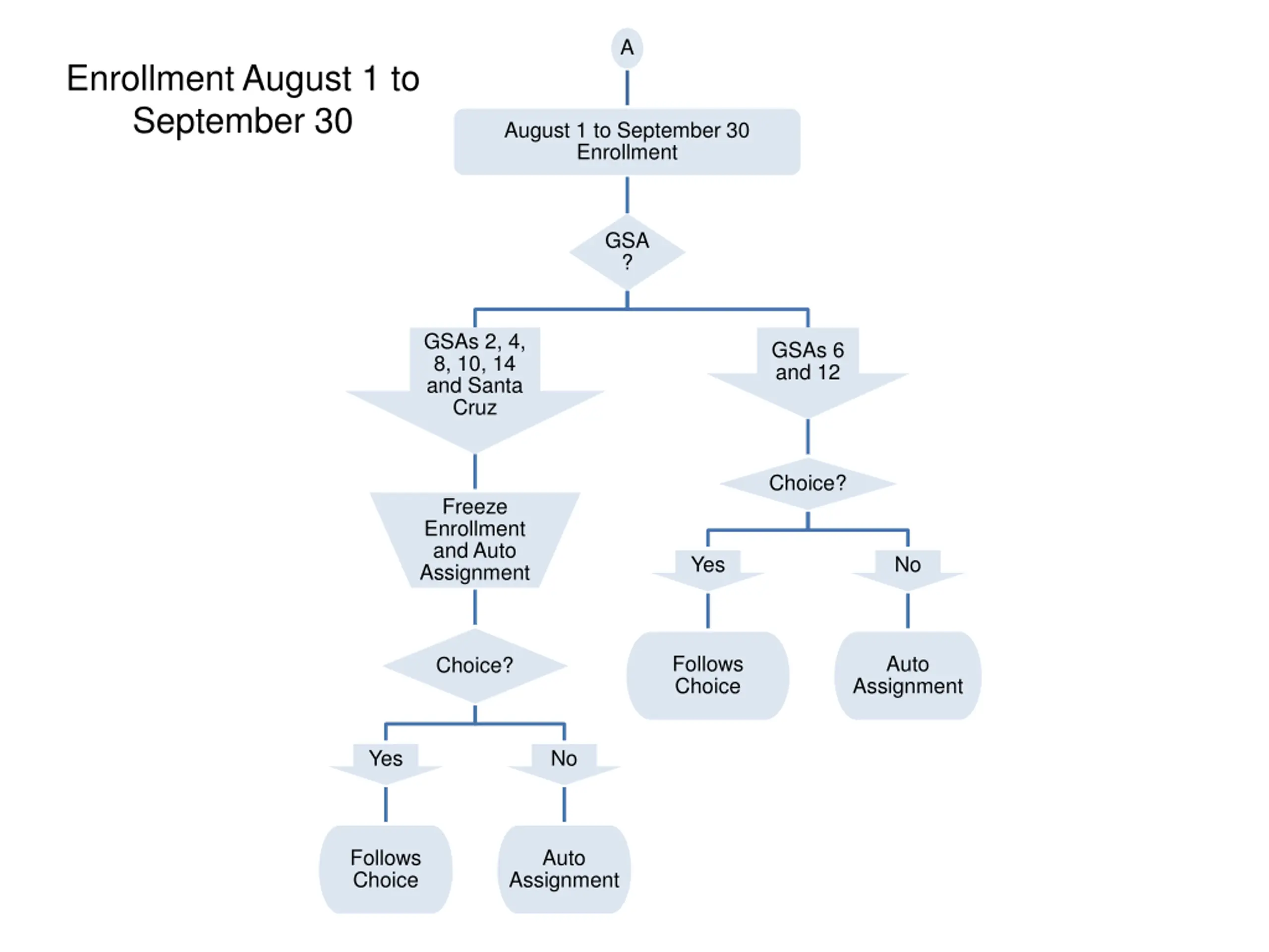 A Enrollment August 1 to September 30 August 1 to September 30 Enrollment GSA ? GSAs 2, 4, 8, 10, 14 and Santa Cruz GSAs 6 and 12 Choice? Freeze Enrollment and Auto Assignment Yes No Follows Choice Auto Choice? Assignment Yes No Follows Choice Auto Assignment