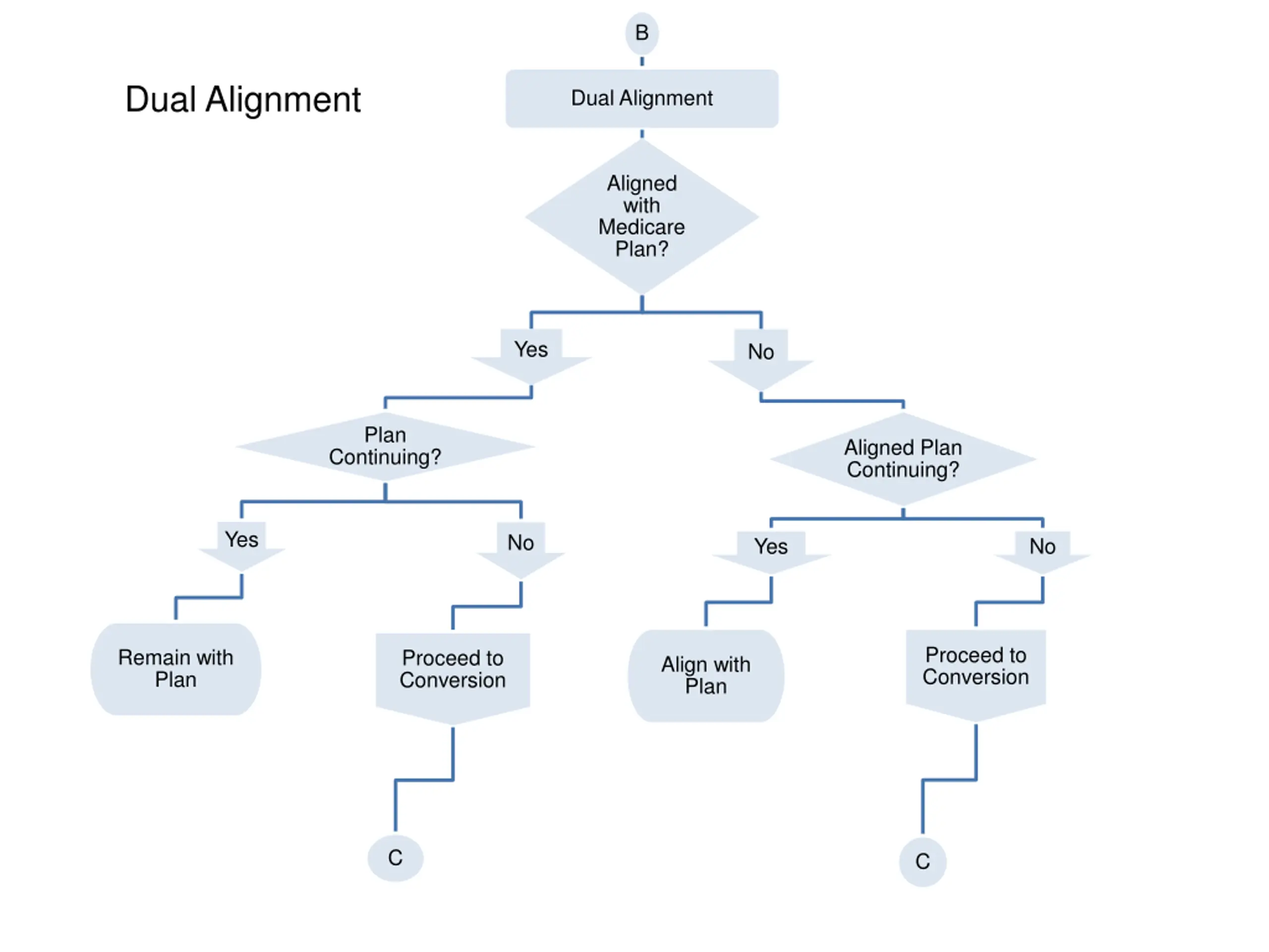 B Dual Alignment Dual Alignment Aligned with Medicare Plan? Yes No Plan Aligned Plan Continuing? Continuing? Yes No Yes No Proceed to Conversion Remain with Plan Proceed to Conversion Align with Plan C C