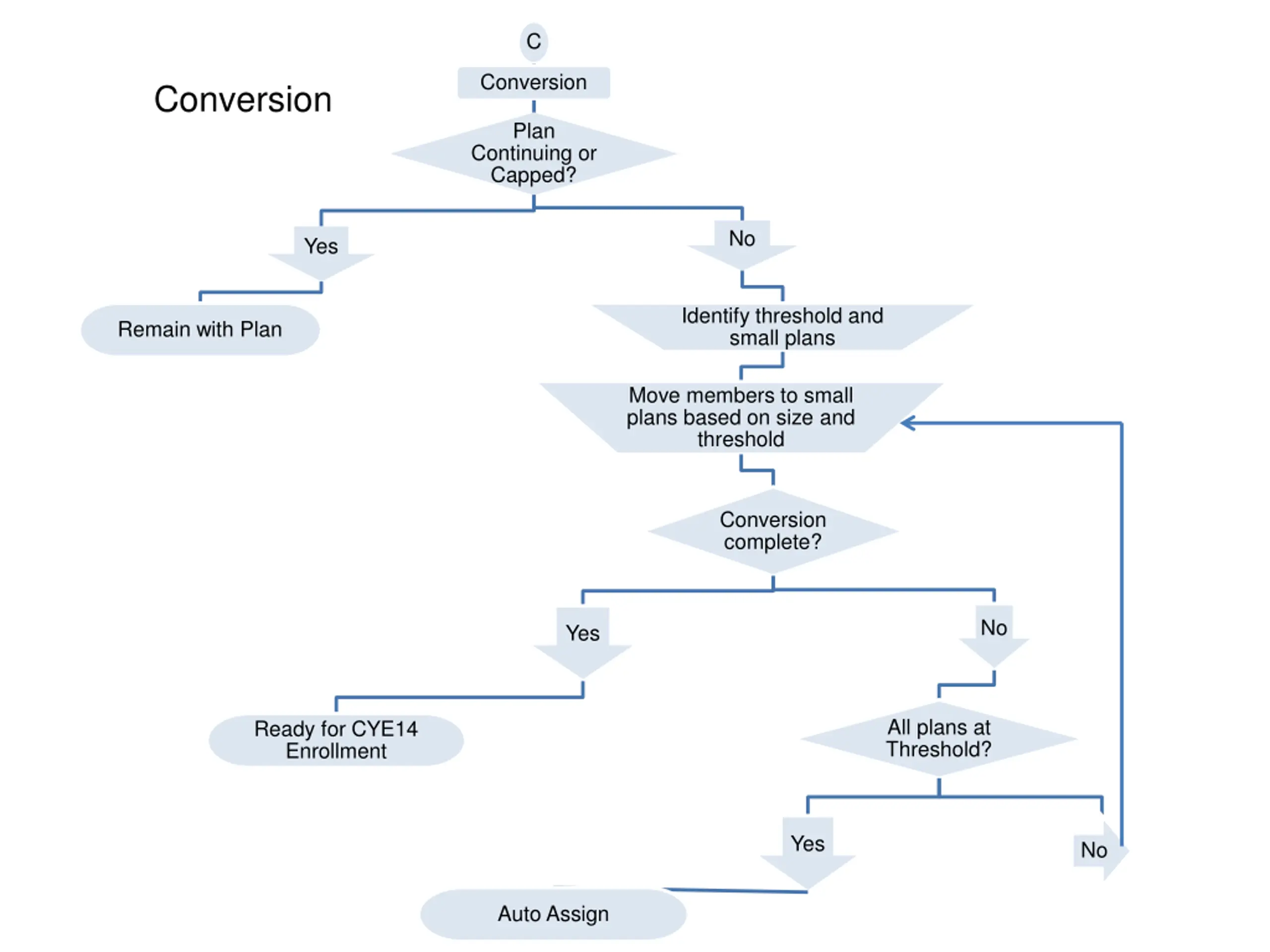 C Conversion Conversion Plan Continuing or Capped? No Yes Identify threshold and small plans Remain with Plan Move members to small plans based on size and threshold Conversion complete? No Yes All plans at Threshold? Ready for CYE14 Enrollment Yes No Auto Assign