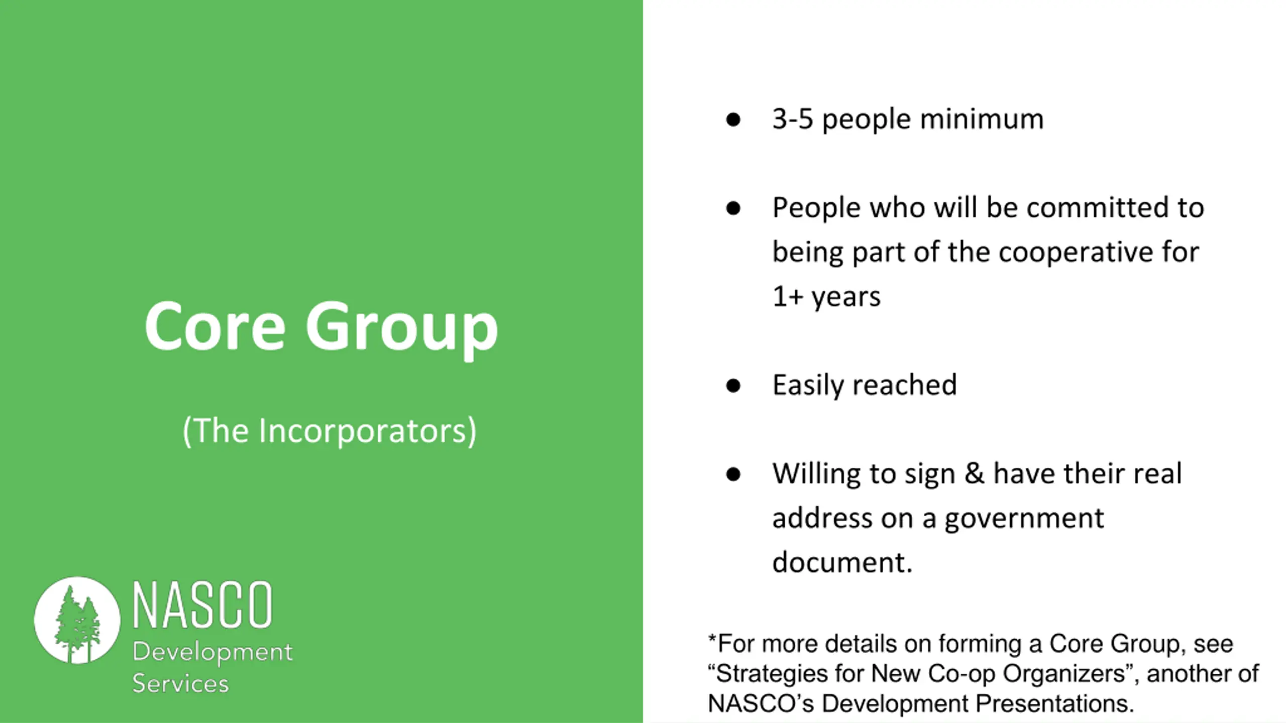 3-5 people minimum People who will be committed to being part of the cooperative for 1+ years Core Group Easily reached (The Incorporators) Willing to sign & have their real address on a government document. *For more details on forming a Core Group, see Strategies for New Co-op Organizers , another of NASCO s Development Presentations.
