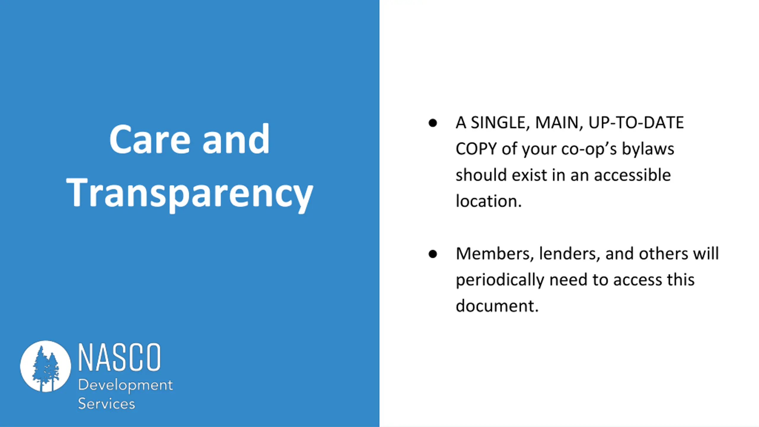A SINGLE, MAIN, UP-TO-DATE COPY of your co-op s bylaws should exist in an accessible location. Care and Transparency Members, lenders, and others will periodically need to access this document.