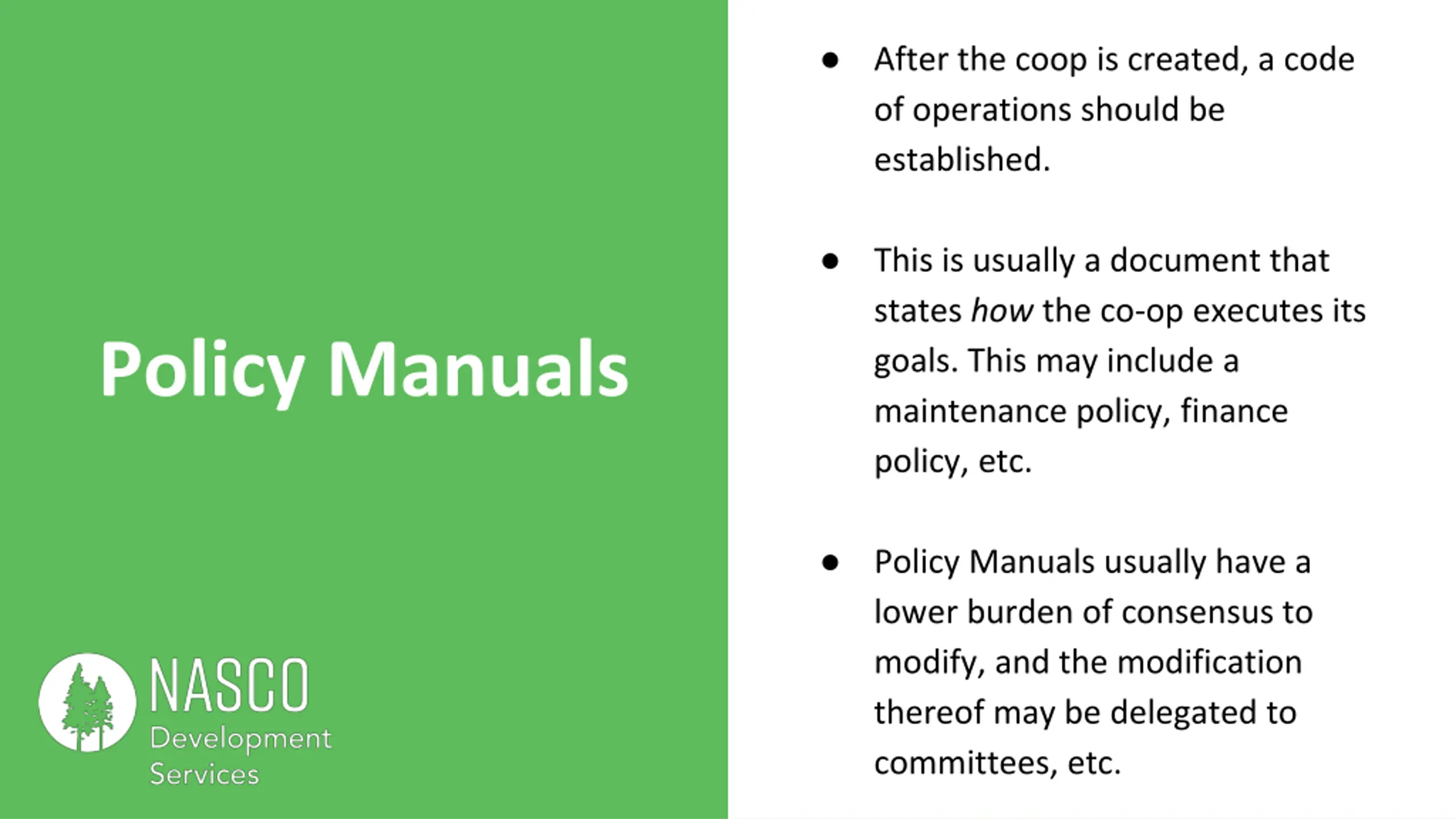 After the coop is created, a code of operations should be established. This is usually a document that states how the co-op executes its goals. This may include a maintenance policy, finance policy, etc. Policy Manuals Policy Manuals usually have a lower burden of consensus to modify, and the modification thereof may be delegated to committees, etc.