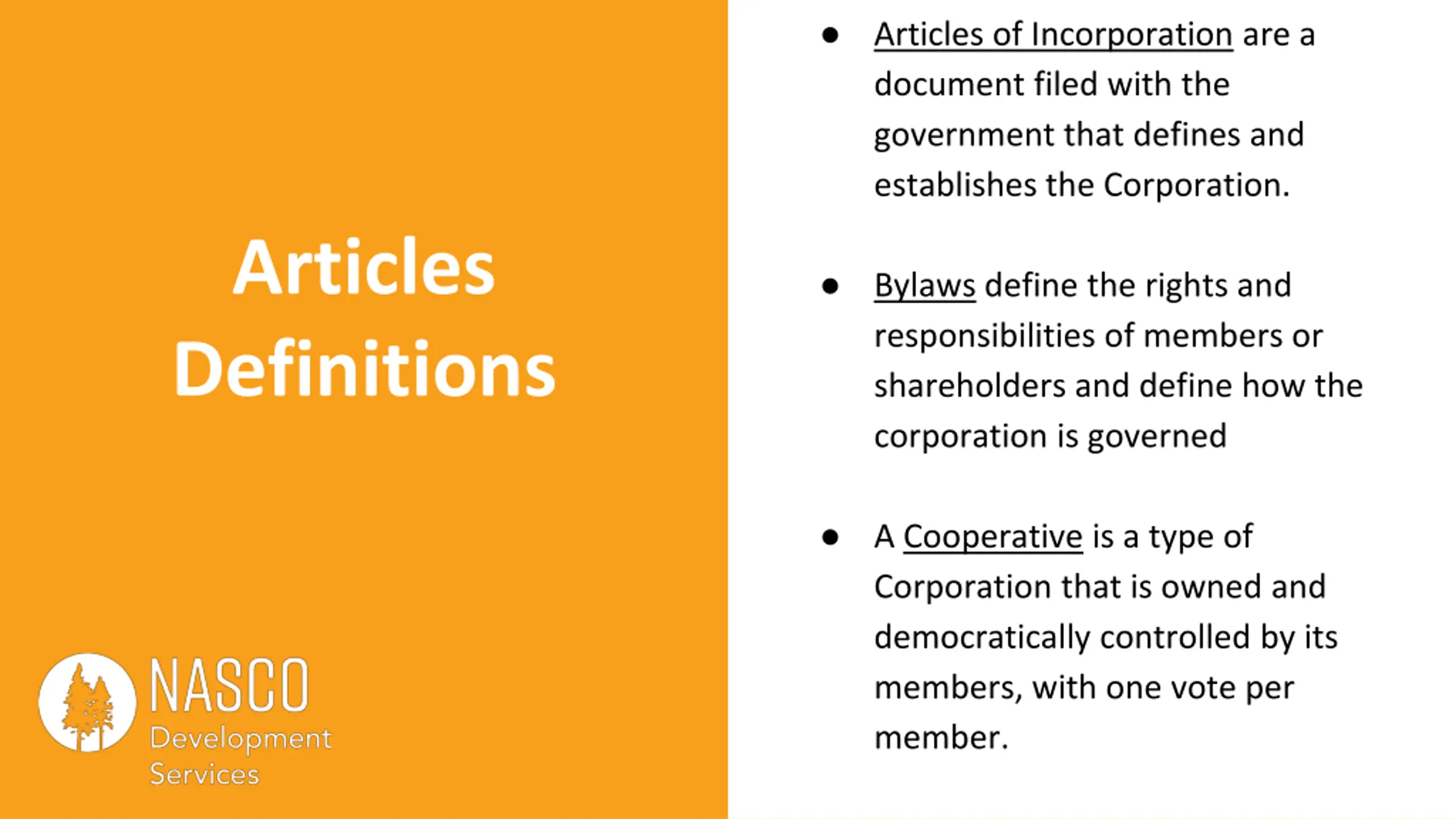 Articles of Incorporation are a document filed with the government that defines and establishes the Corporation. Articles Definitions Bylaws define the rights and responsibilities of members or shareholders and define how the corporation is governed A Cooperative is a type of Corporation that is owned and democratically controlled by its members, with one vote per member.