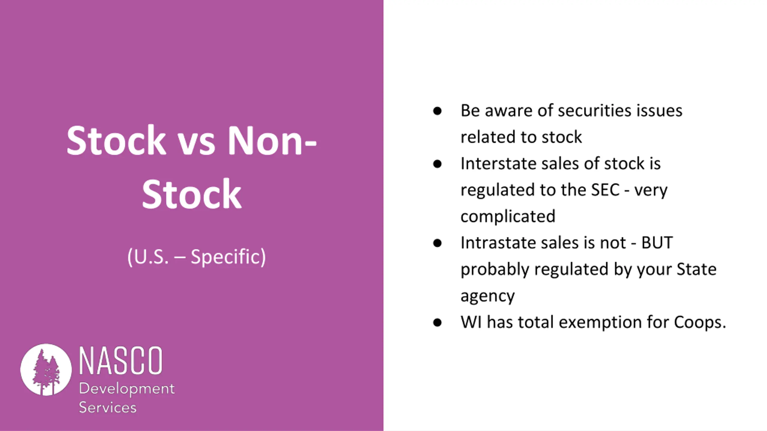 Be aware of securities issues related to stock Interstate sales of stock is regulated to the SEC - very complicated Intrastate sales is not - BUT probably regulated by your State agency WI has total exemption for Coops. Stock vs Non- Stock (U.S. Specific)