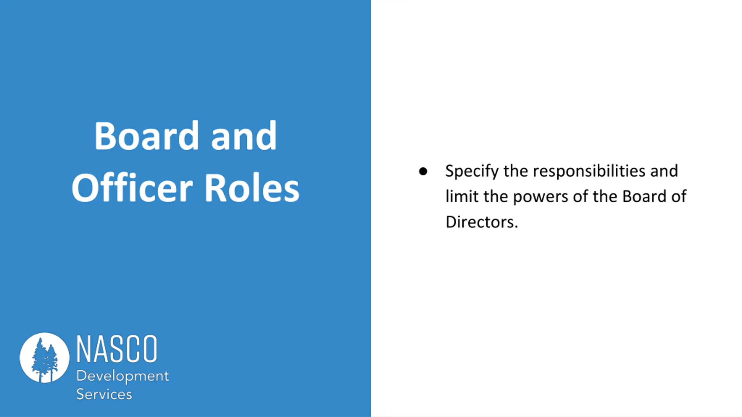 Board and Officer Roles Specify the responsibilities and limit the powers of the Board of Directors.
