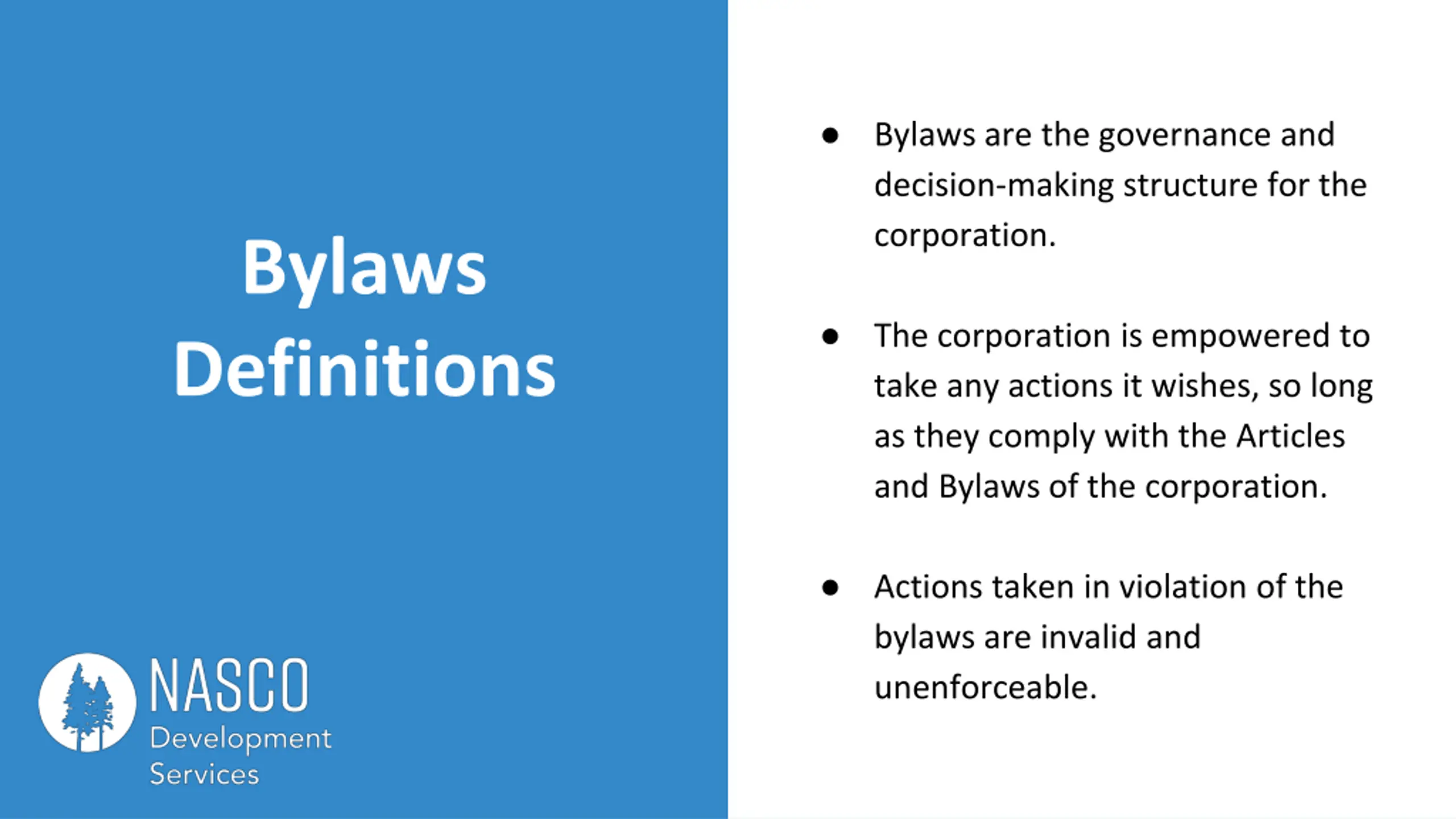 Bylaws are the governance and decision-making structure for the corporation. Bylaws Definitions The corporation is empowered to take any actions it wishes, so long as they comply with the Articles and Bylaws of the corporation. Actions taken in violation of the bylaws are invalid and unenforceable.