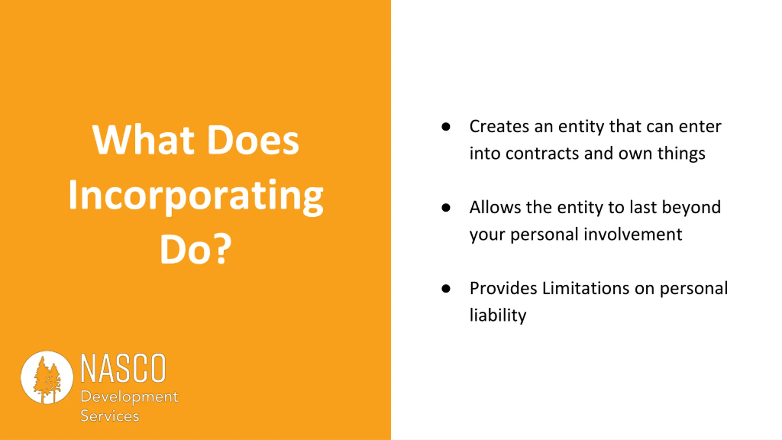 Creates an entity that can enter into contracts and own things What Does Incorporating Do? Allows the entity to last beyond your personal involvement Provides Limitations on personal liability