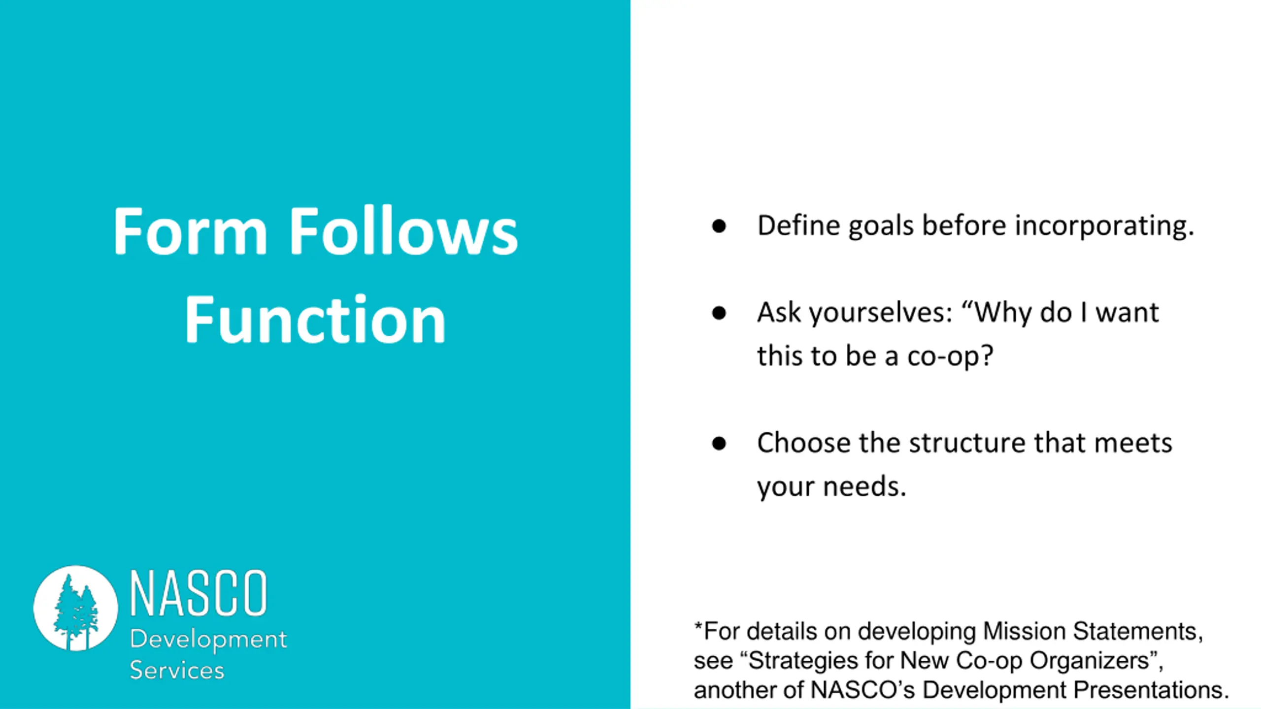 Form Follows Function Define goals before incorporating. Ask yourselves: Why do I want this to be a co-op? Choose the structure that meets your needs. *For details on developing Mission Statements, see Strategies for New Co-op Organizers , another of NASCO s Development Presentations.