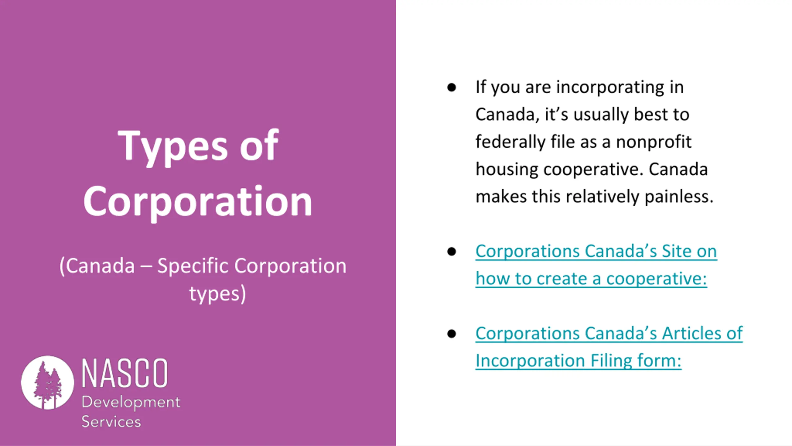 If you are incorporating in Canada, it s usually best to federally file as a nonprofit housing cooperative. Canada makes this relatively painless. Types of Corporation Corporations Canada s Site on how to create a cooperative: (Canada Specific Corporation types) Corporations Canada s Articles of Incorporation Filing form: