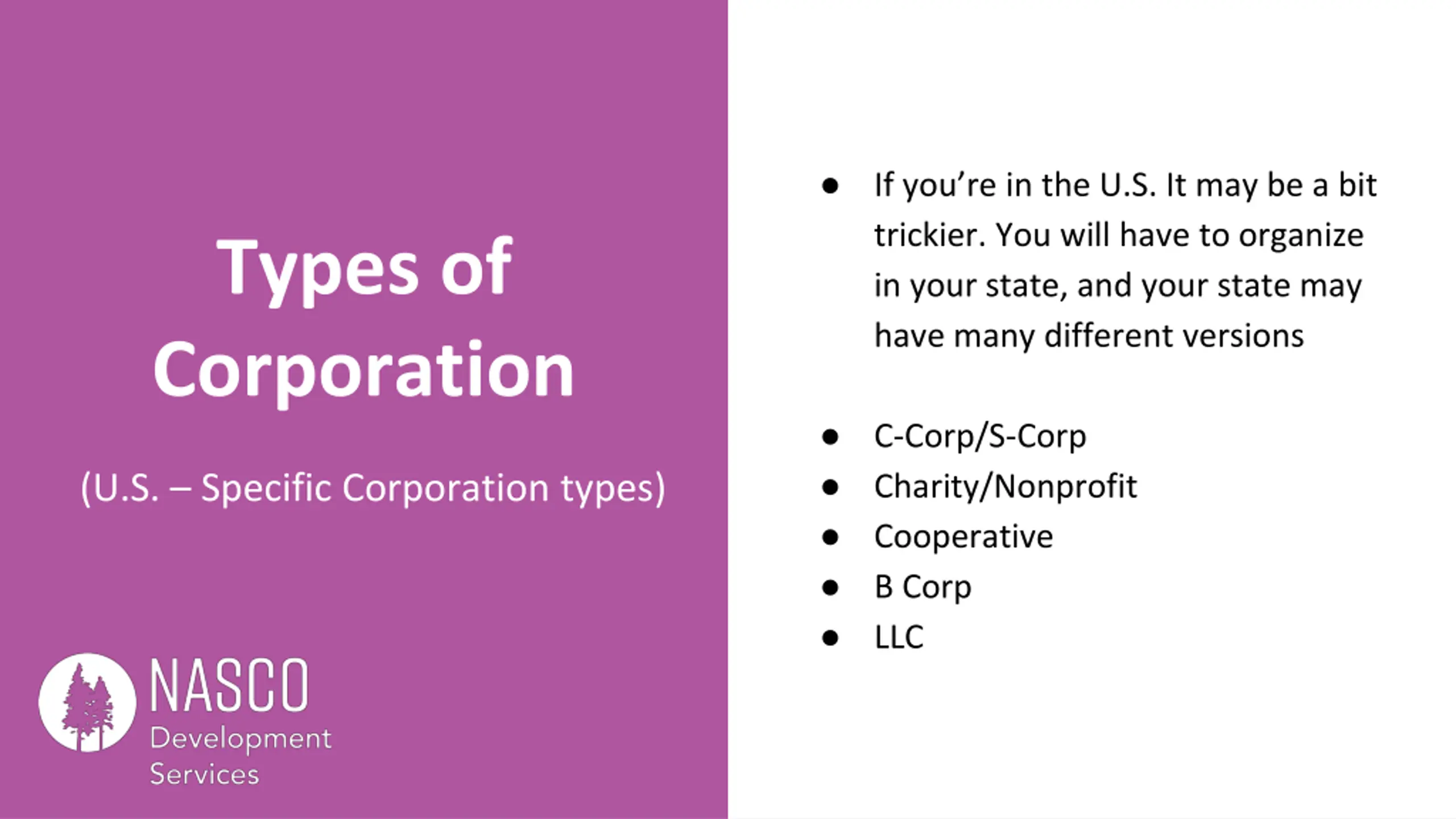 If youre in the U.S. It may be a bit trickier. You will have to organize in your state, and your state may have many different versions Types of Corporation C-Corp/S-Corp Charity/Nonprofit Cooperative B Corp LLC (U.S. Specific Corporation types)