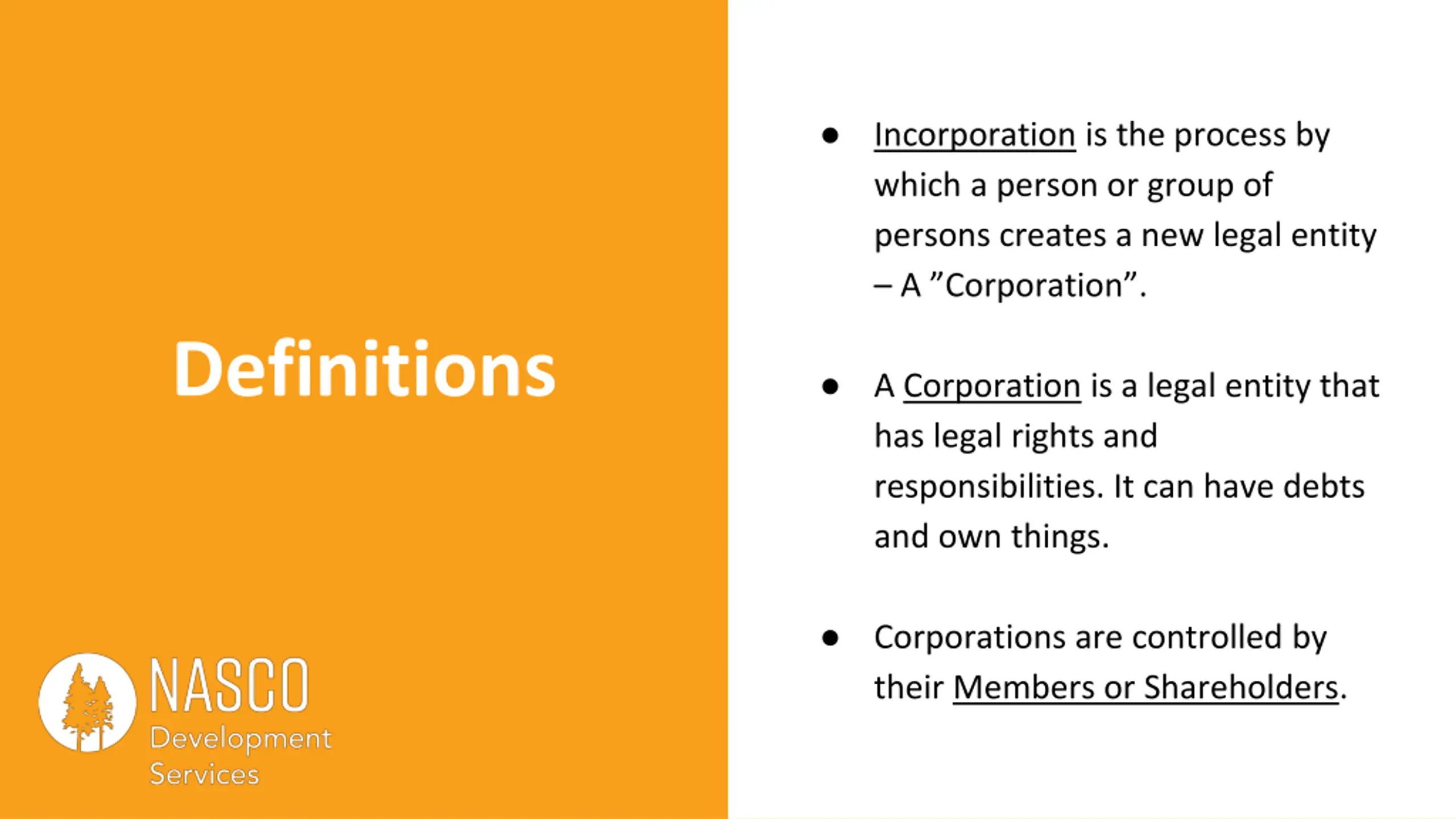 Incorporation is the process by which a person or group of persons creates a new legal entity A Corporation . Definitions A Corporation is a legal entity that has legal rights and responsibilities. It can have debts and own things. Corporations are controlled by their Members or Shareholders.