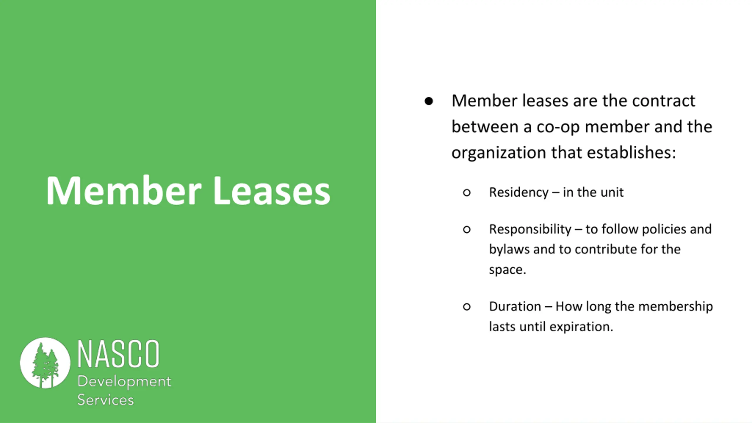 Member leases are the contract between a co-op member and the organization that establishes: Member Leases Residency in the unit Responsibility to follow policies and bylaws and to contribute for the space. Duration How long the membership lasts until expiration.