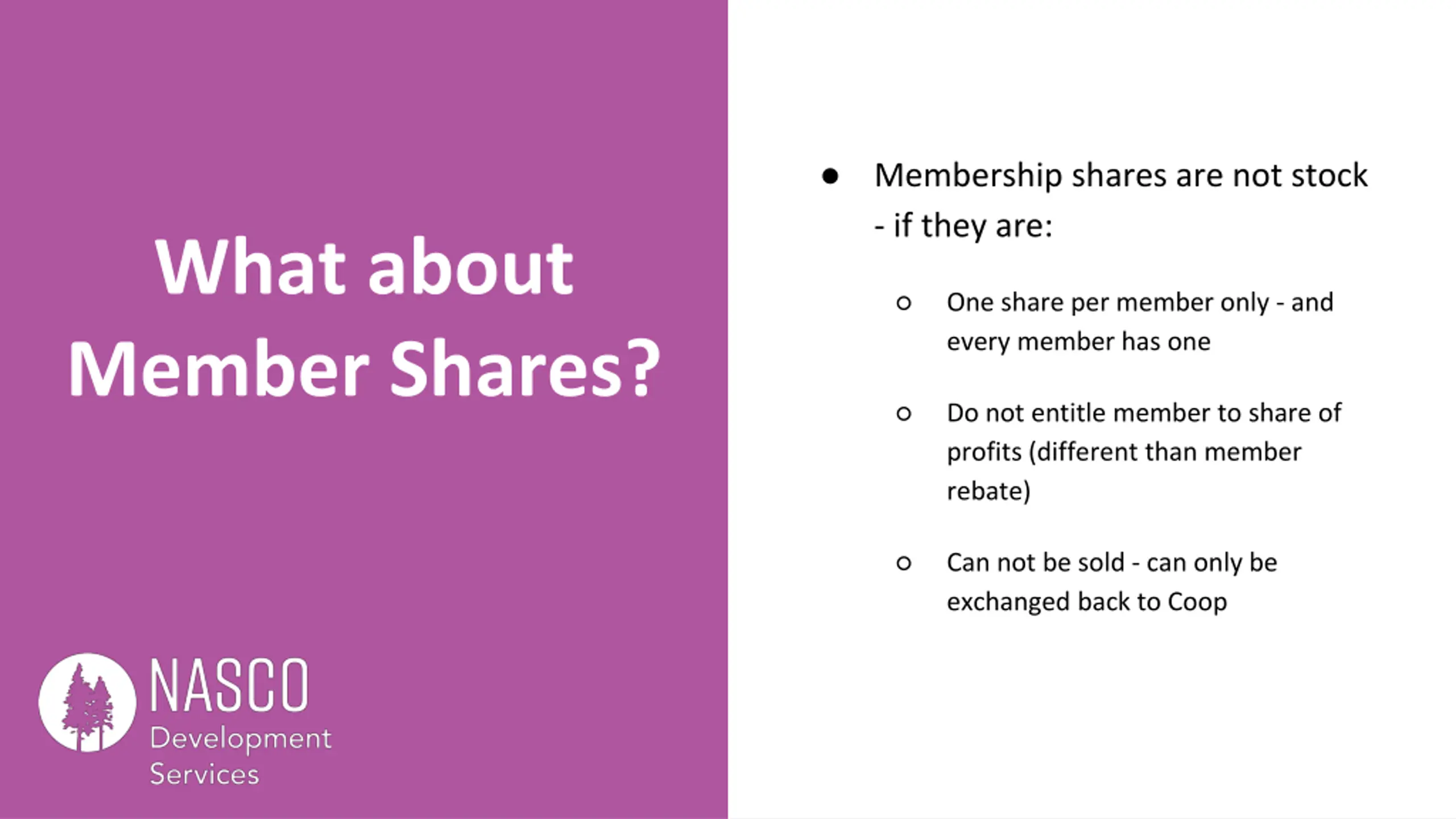 Membership shares are not stock - if they are: What about Member Shares? One share per member only - and every member has one Do not entitle member to share of profits (different than member rebate) Can not be sold - can only be exchanged back to Coop