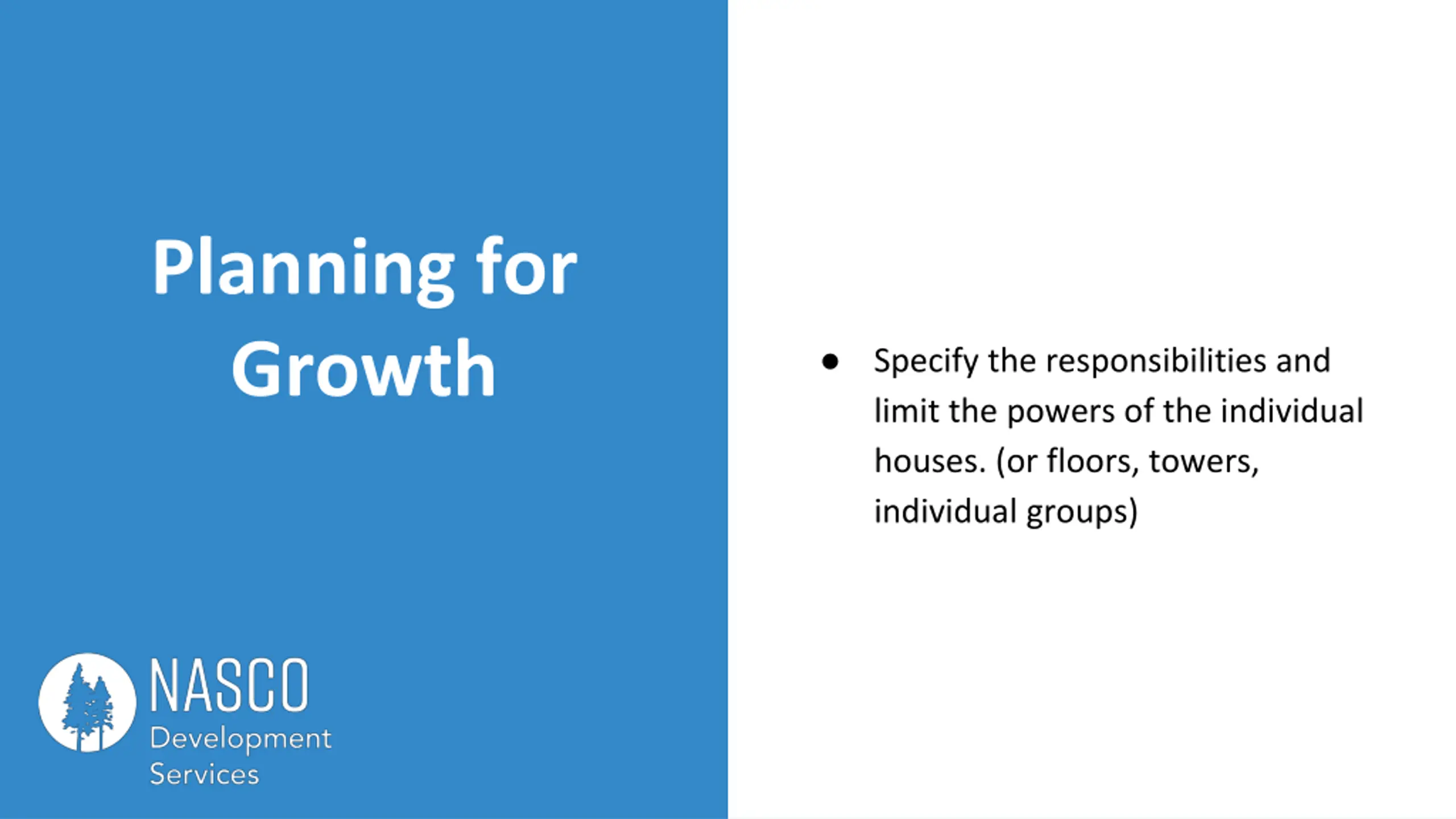 Planning for Growth Specify the responsibilities and limit the powers of the individual houses. (or floors, towers, individual groups)