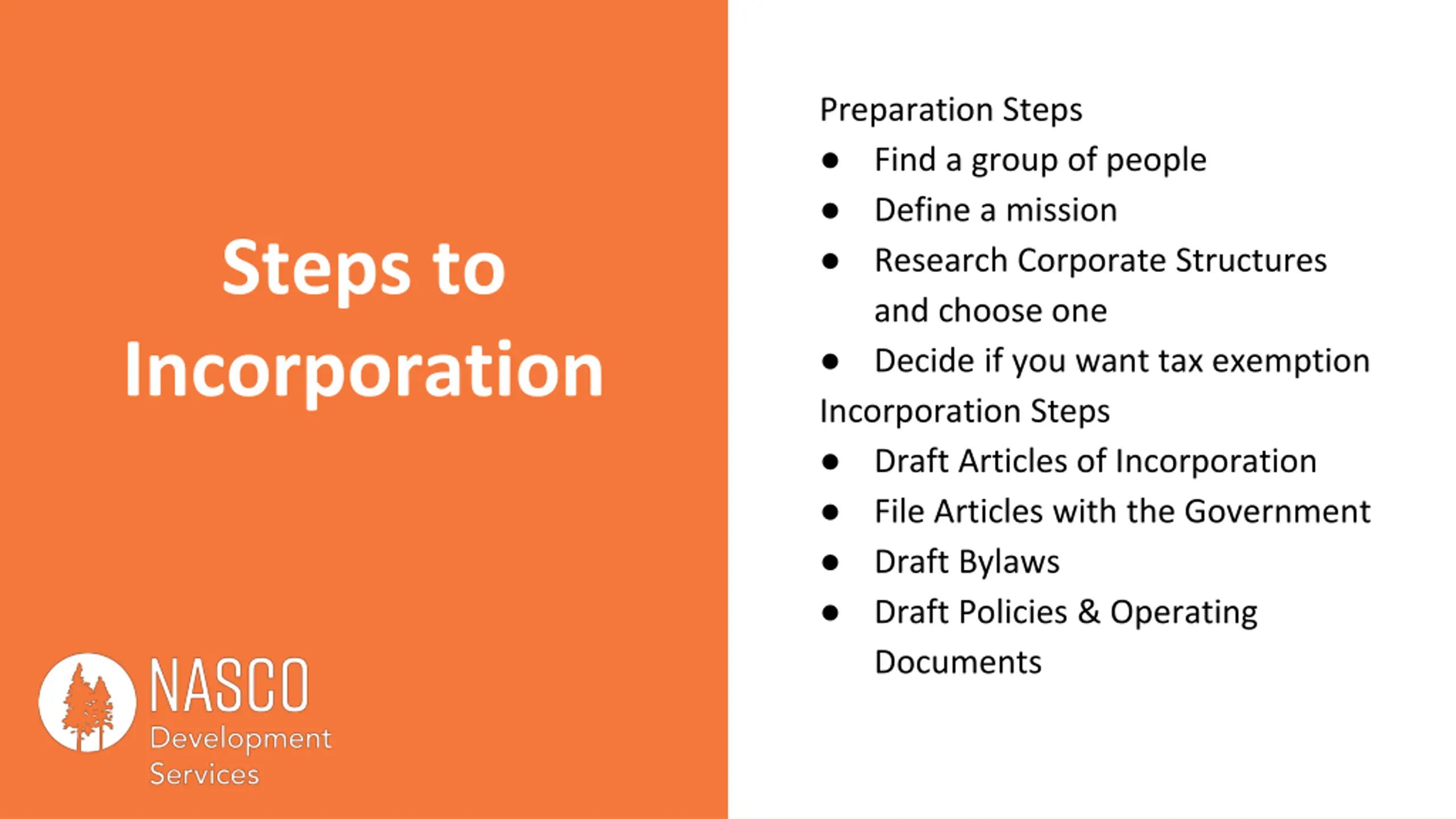 Preparation Steps Find a group of people Define a mission Research Corporate Structures and choose one Decide if you want tax exemption Incorporation Steps Draft Articles of Incorporation File Articles with the Government Draft Bylaws Draft Policies & Operating Documents Steps to Incorporation